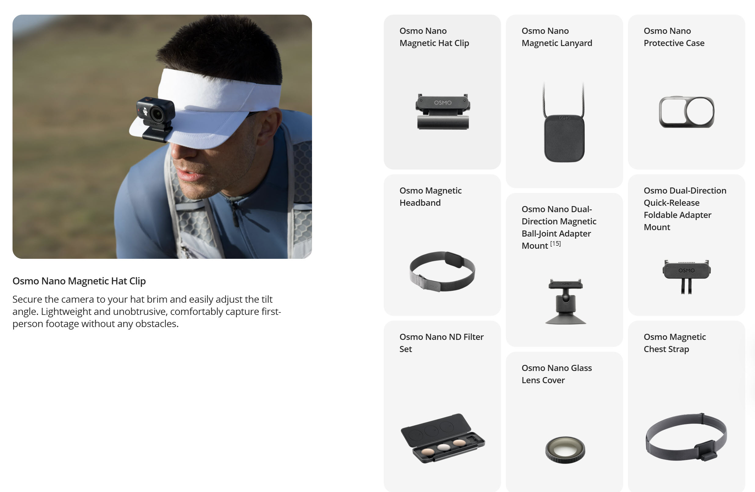 Ngoài ra, DJI còn có thêm vài phụ kiện chính hãng khác dạng bán rời, dành riêng cho Osmo Nano để bạn đầu tư nếu muốn, bao gồm: vòng đeo đầu có hít nam châm, bộ ND Filter, nắp len thay thế, dây đeo ngực.