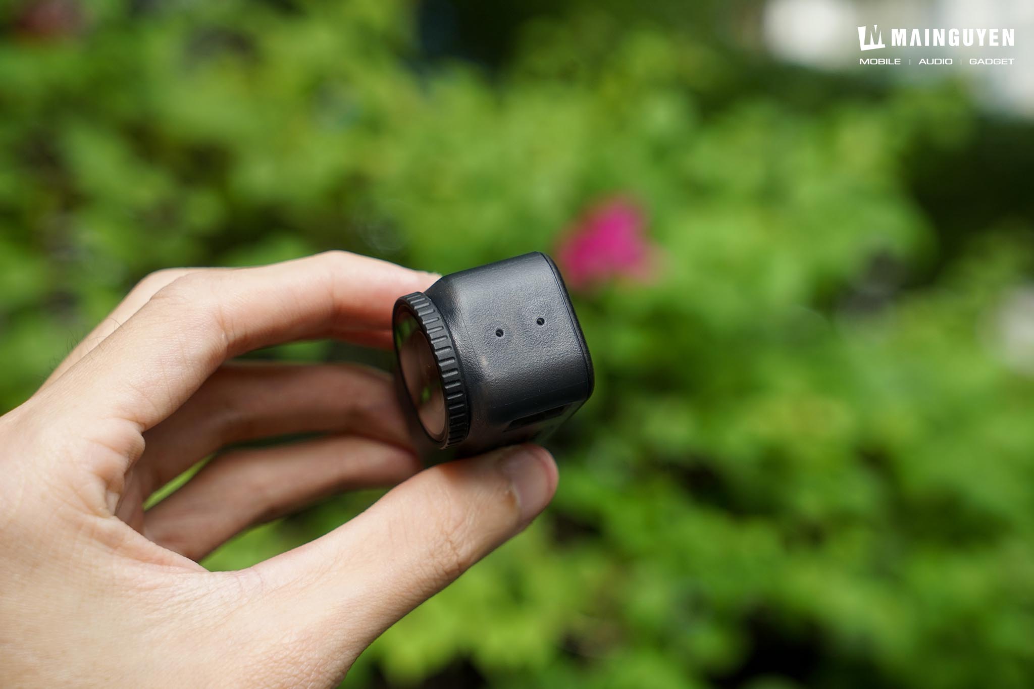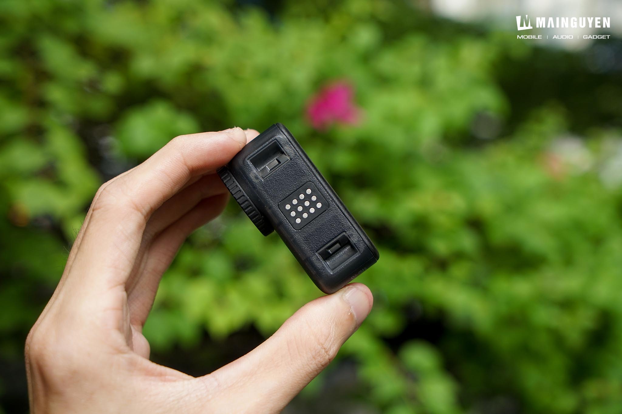 Hai cạnh bên cụm vision dock bố trí nút bấm mềm tương tự như trên cụm camera và cũng chỉ có 1 nút bấm duy nhất để bạn thao tác các tính năng cơ bản. Nút bấm để mở khóa ngàm kẹp, cổng sạc và khe thẻ nhớ microSD được che đậy kín bằng nắp che đóng mở thay vì kiểu thiết kế nắp trượt có ngàm khóa như trên action cam.