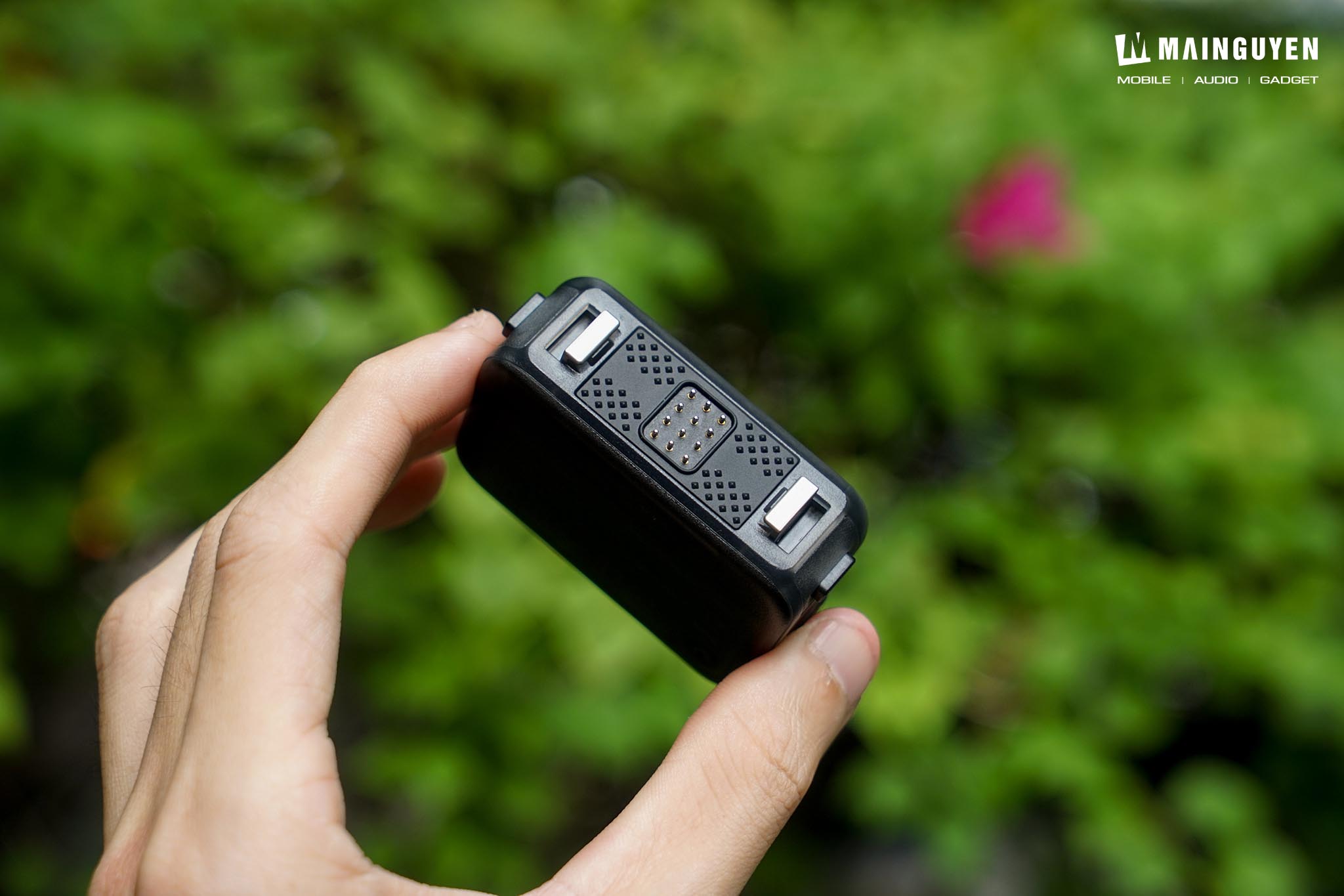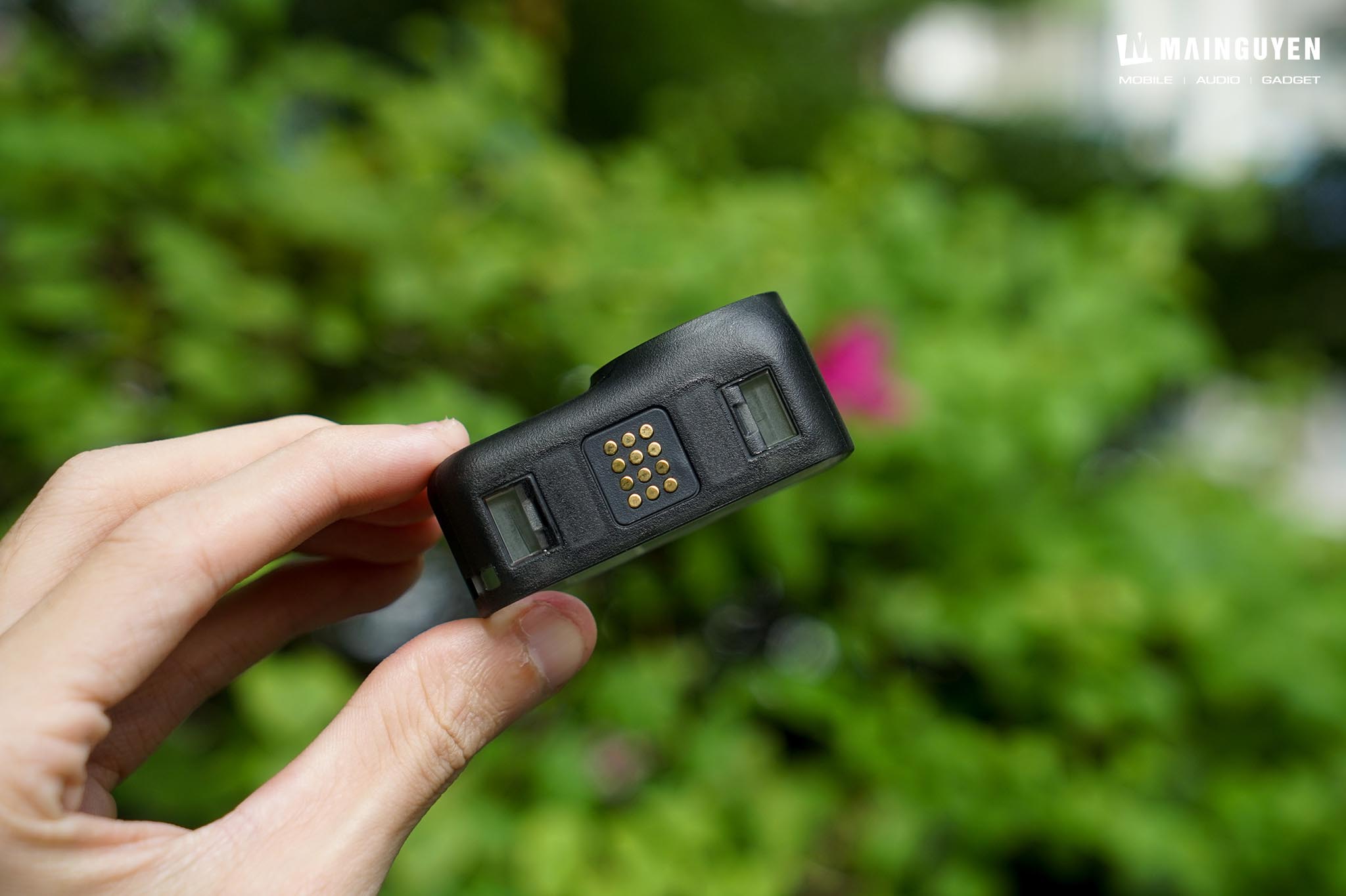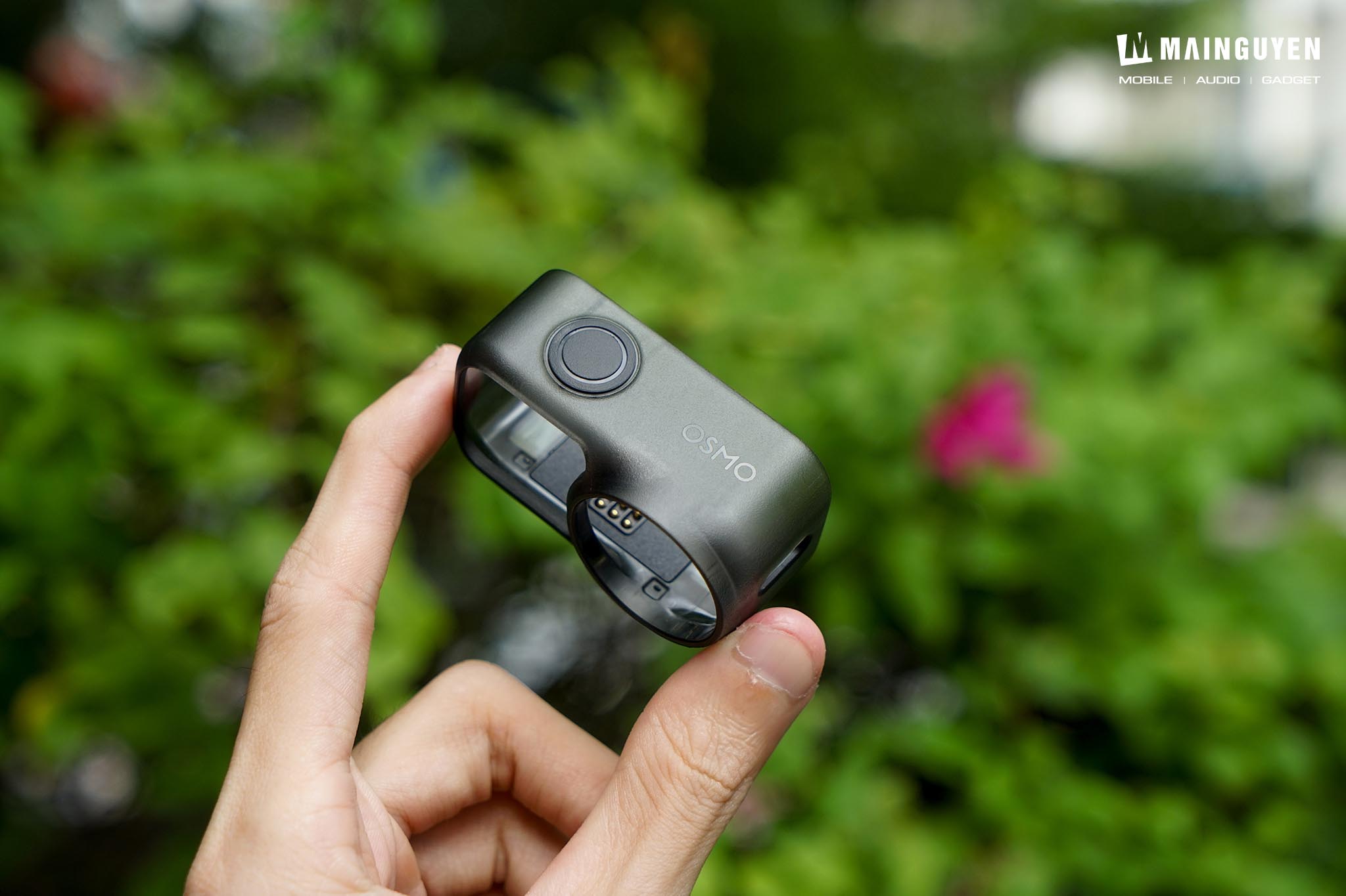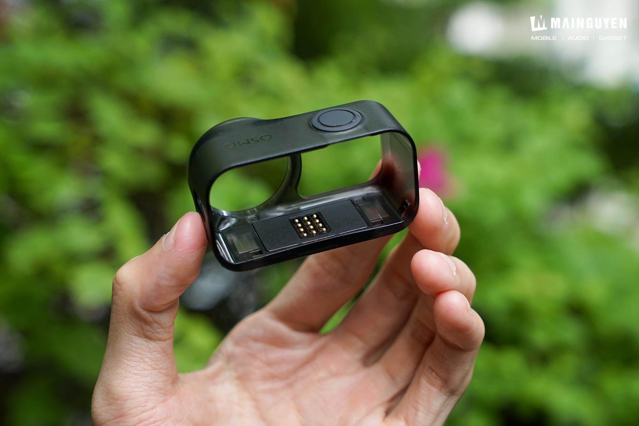 Cạnh dưới là khu vực hít nam châm và các chân kim loại để giữ cố định chắc chắn, truyền dữ liệu và sạc điện cho cụm camera. Bạn cũng có thể dùng chung phần ngàm hít nam châm trên action cam hoặc camera 360 cho Osmo Nano.