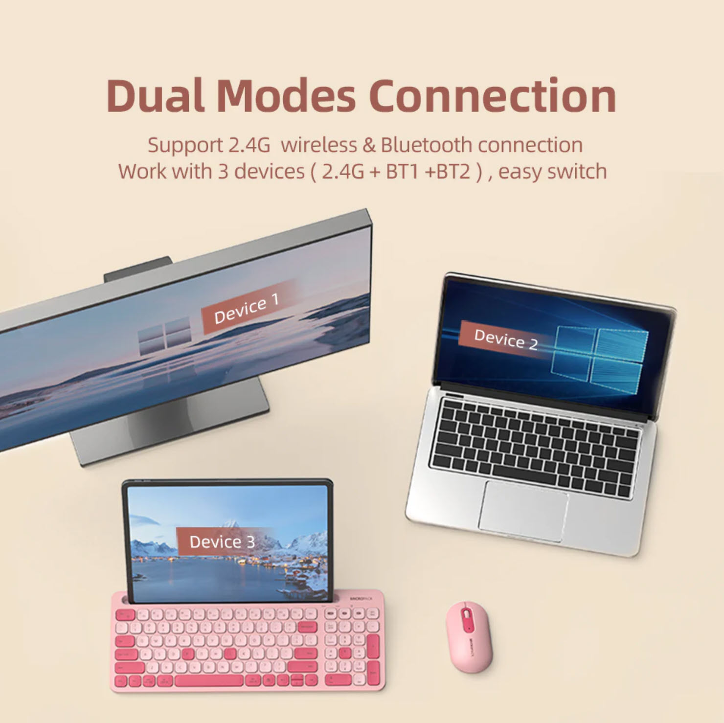 Bộ combo này sử dụng công nghệ không dây 2.4Ghz, kết nối thông qua một đầu thu USB duy nhất. Việc cài đặt rất đơn giản: chỉ cần cắm đầu thu vào máy tính là bạn có thể sử dụng ngay lập tức, không cần cài đặt thêm phần mềm. Phạm vi kết nối ổn định trong khoảng 10 mét, đủ để bạn thoải mái sử dụng mà không lo bị mất tín hiệu. Hỗ trợ kết nối đồng thời 3 thiết bị cùng lúc và chuyển qua lại giữa các thiết bị rất dễ dàng.
