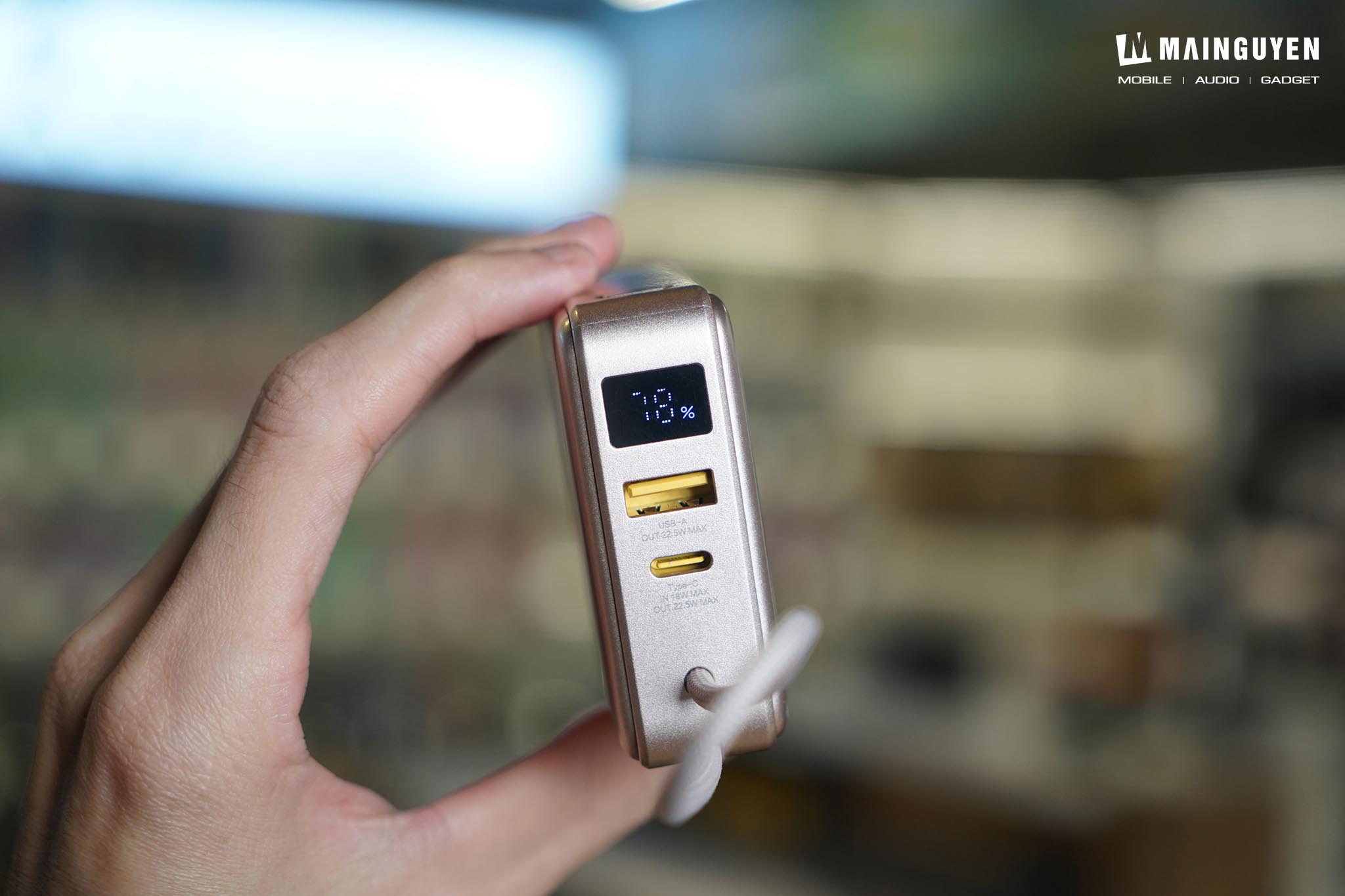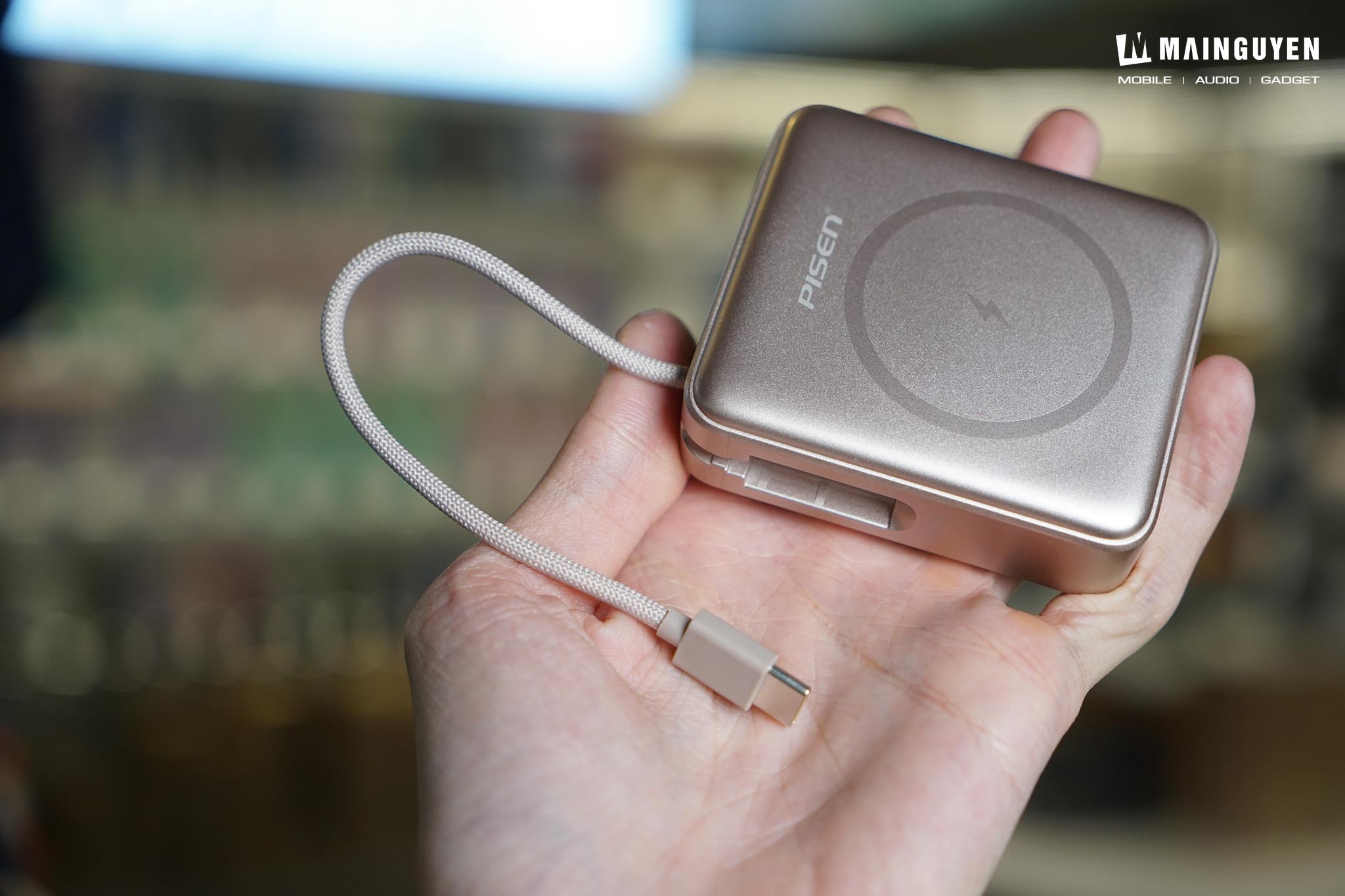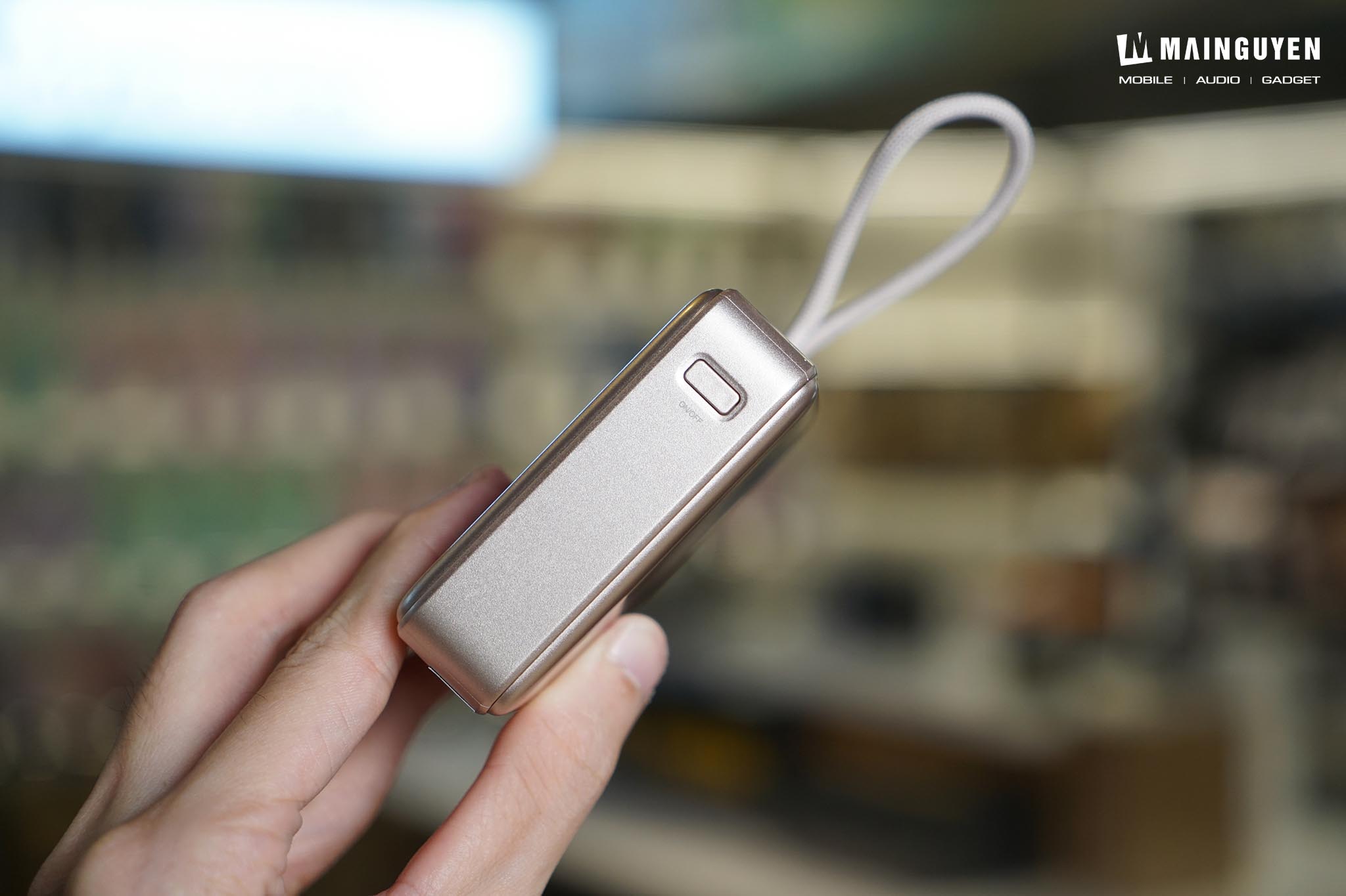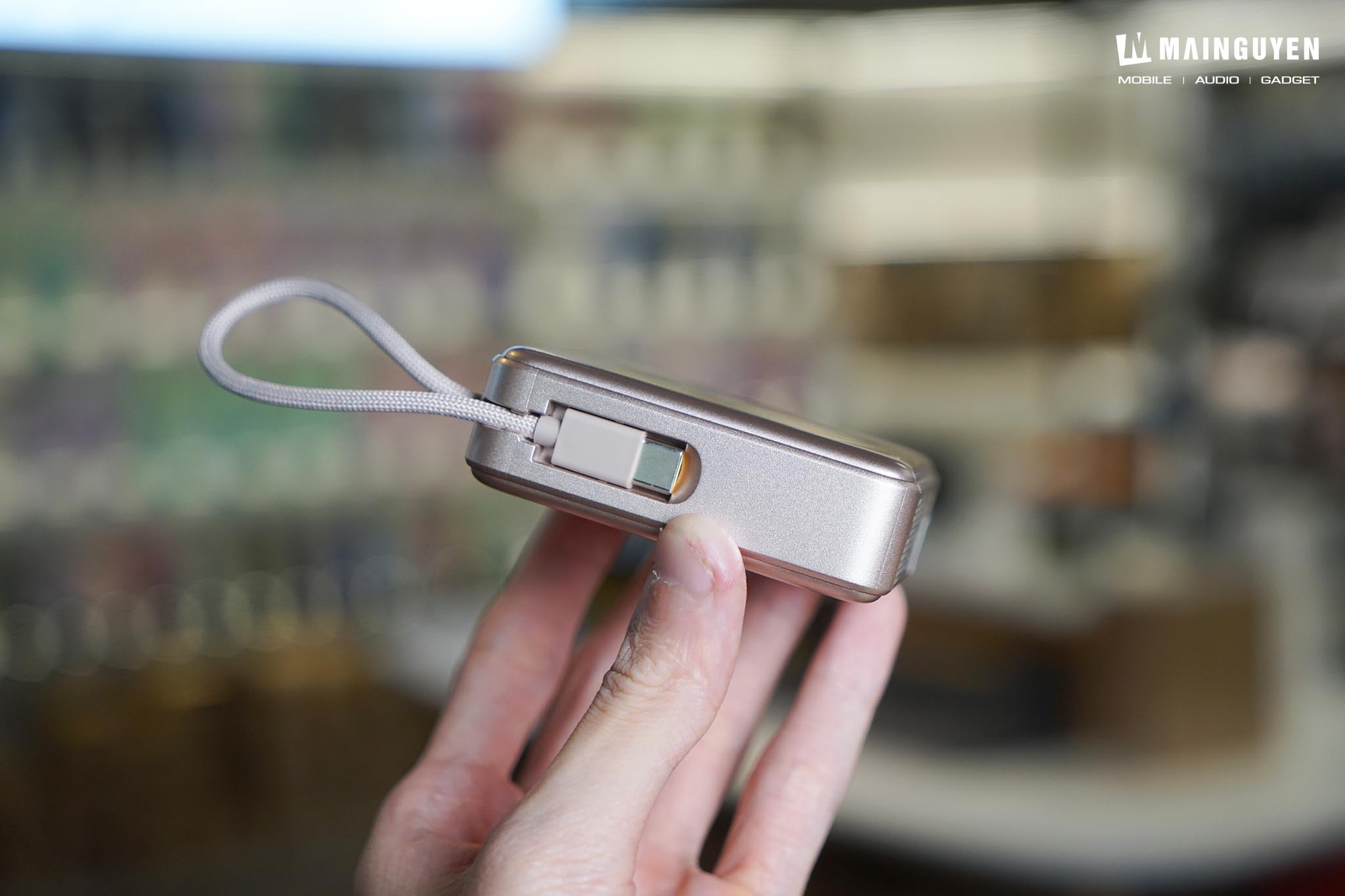 Điểm nổi bật tiếp theo là tích hợp sẵn sợi cáp sạc USB-C cho các thiết bị Android và iPhone 14 series trở lên, laptop,... Điều này cực kỳ tiện lợi, vì bạn không cần phải mang theo dây sạc, sợi cáp này được thiết kế gọn gàng, có thể cất vào thân pin khi không sử dụng và biến thành quai móc tiện lợi.
