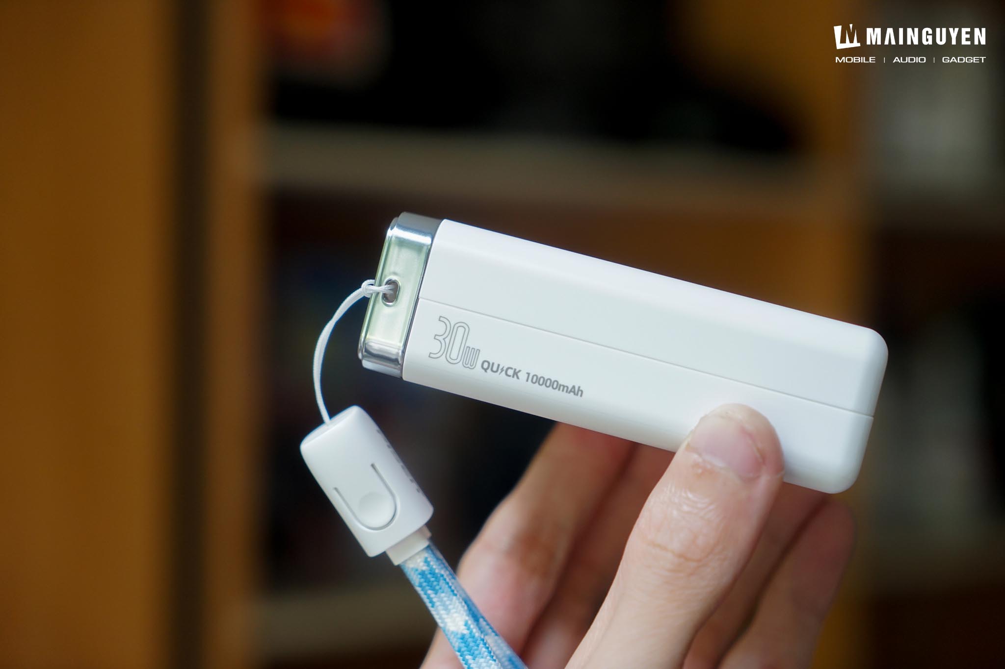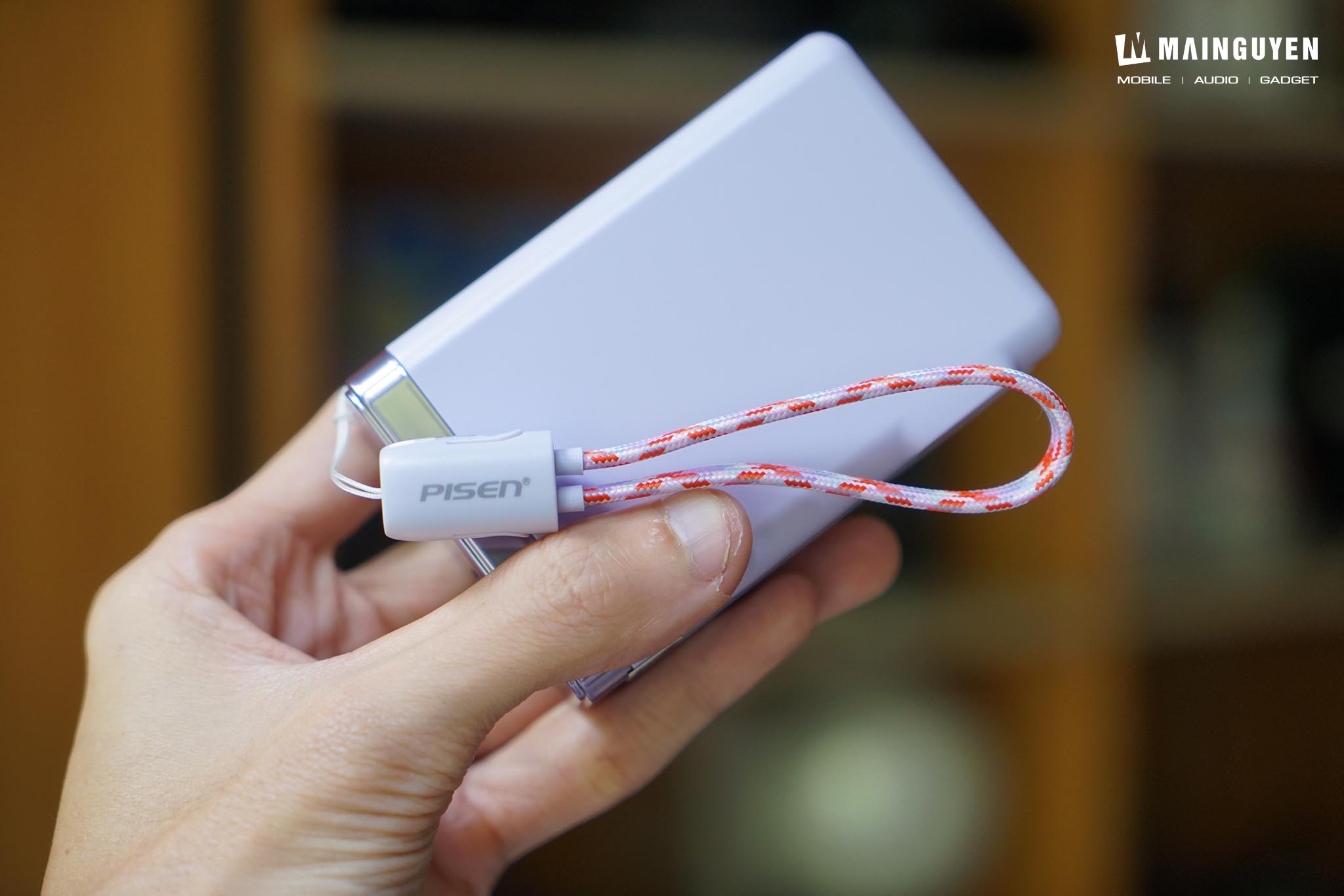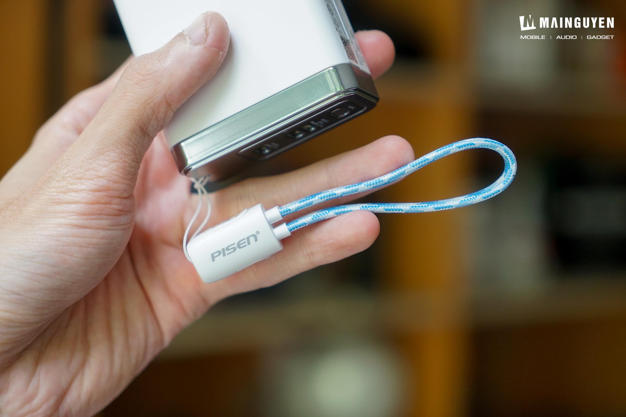 Điểm "ăn tiền" đầu tiên của pin sạc dự phòng Pisen TS-D381 đó là sợi cáp sạc tích hợp với hai đầu USB-C và Lightning, từ đó bạn không cần phải mang thêm sợi cáp nào để sạc cho những thiết bị của Apple dùng cổng Lightning như iPhone 14 series trở xuống, iPad, AirPods. Điểm mình thích là sợi cáp này được thiết kế khéo léo để biến thành quai móc khi không dùng, được bọc kín bằng nắp nhựa có khóa cài.