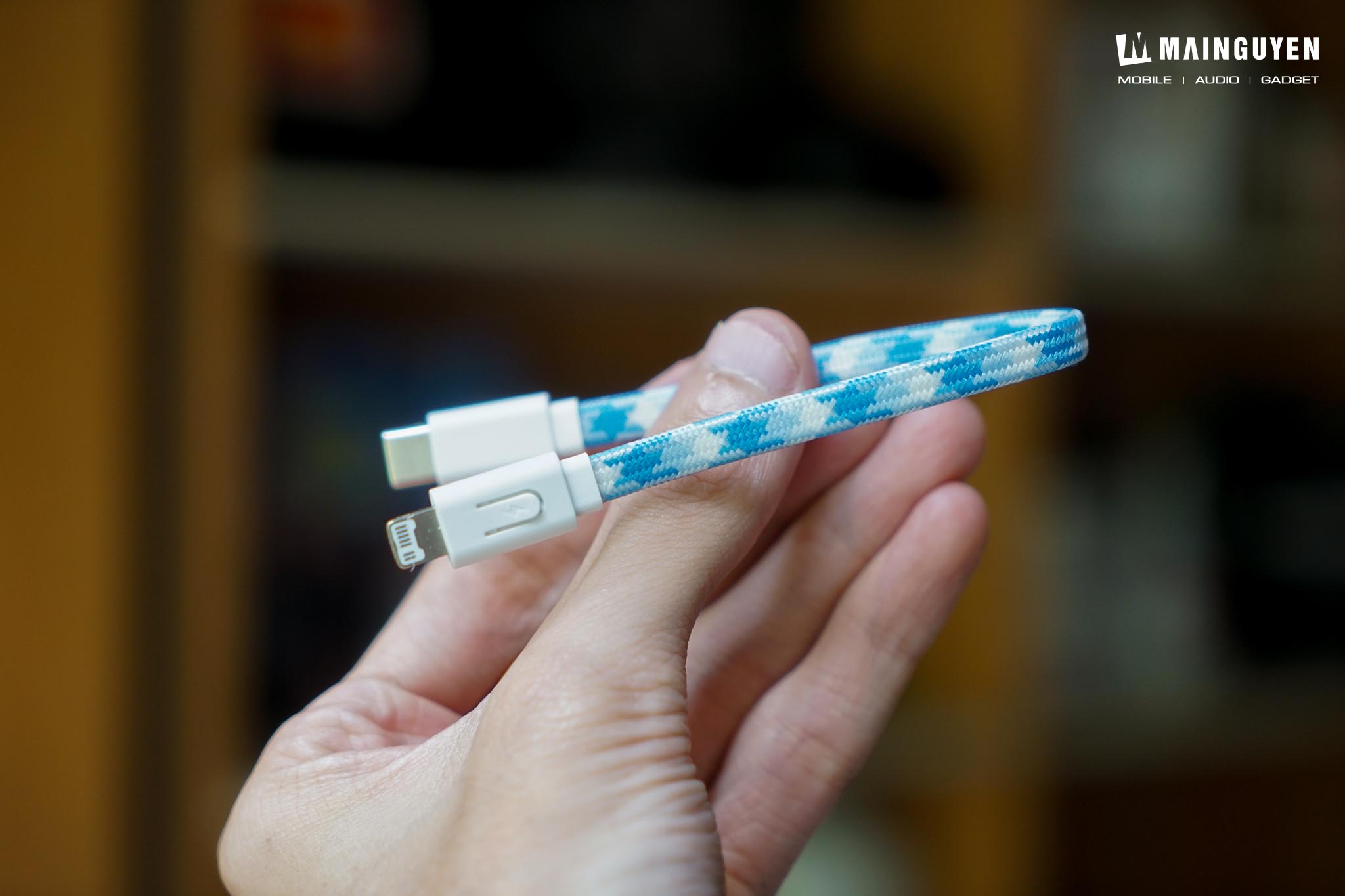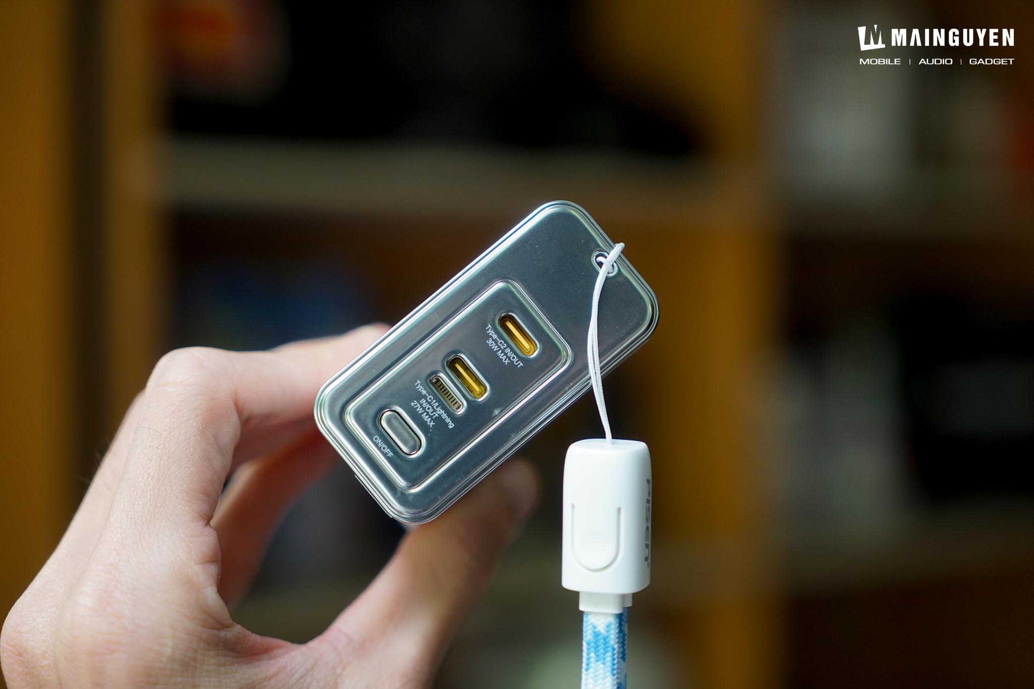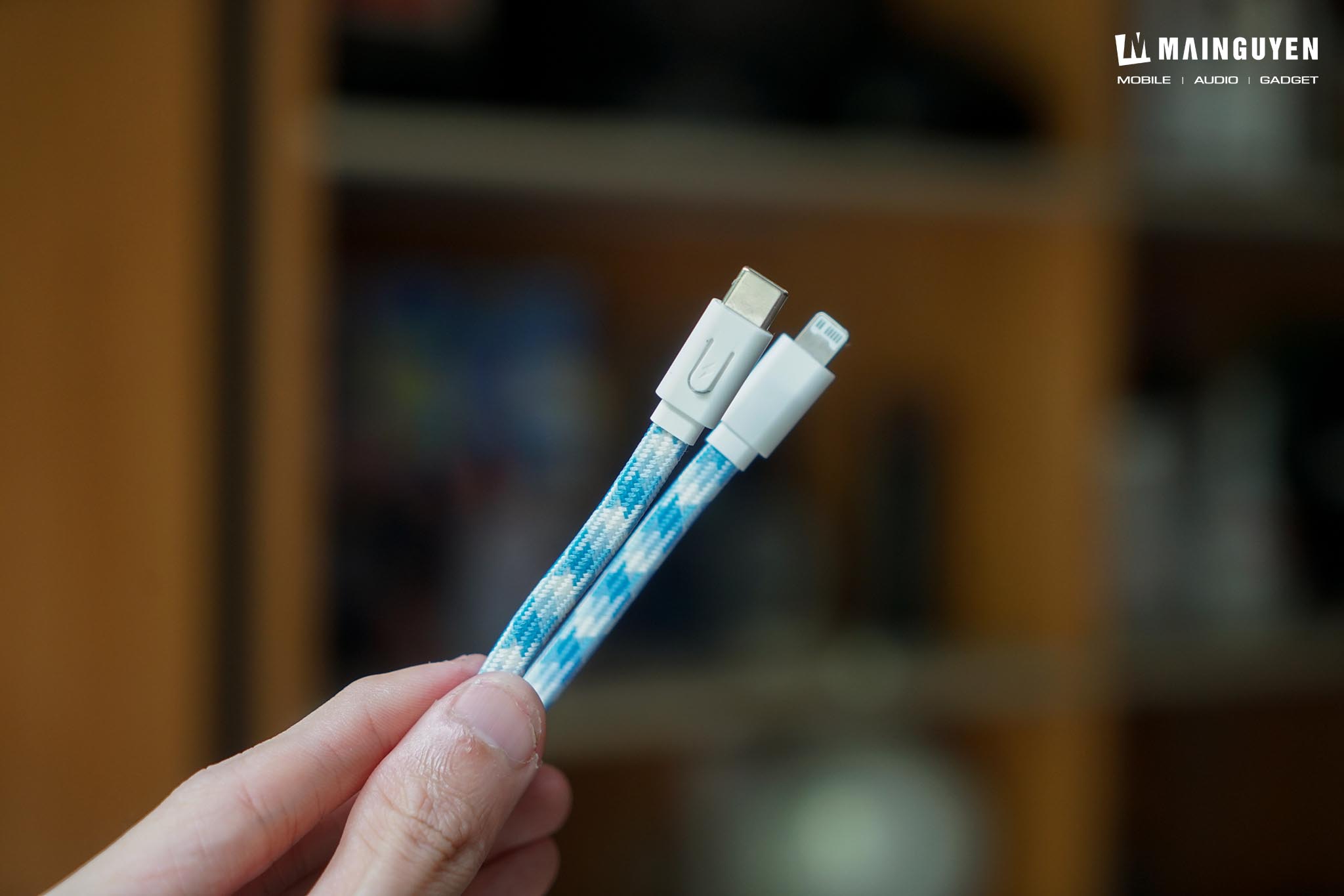 Điểm "ăn tiền" đầu tiên của pin sạc dự phòng Pisen TS-D381 đó là sợi cáp sạc tích hợp với hai đầu USB-C và Lightning, từ đó bạn không cần phải mang thêm sợi cáp nào để sạc cho những thiết bị của Apple dùng cổng Lightning như iPhone 14 series trở xuống, iPad, AirPods. Điểm mình thích là sợi cáp này được thiết kế khéo léo để biến thành quai móc khi không dùng, được bọc kín bằng nắp nhựa có khóa cài.