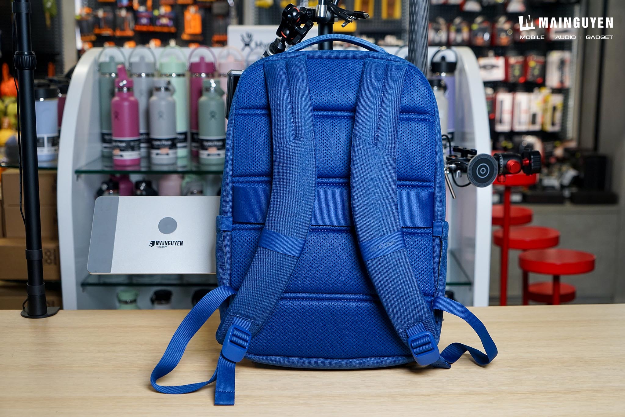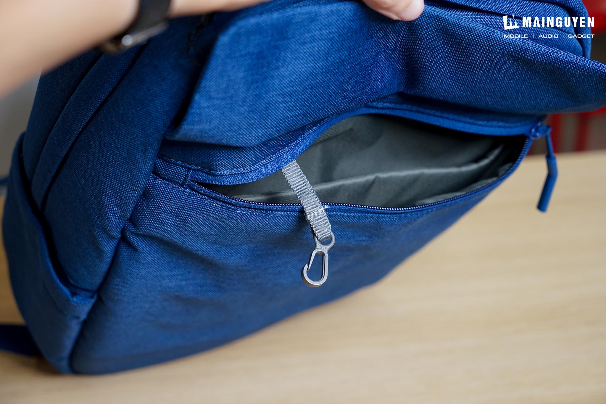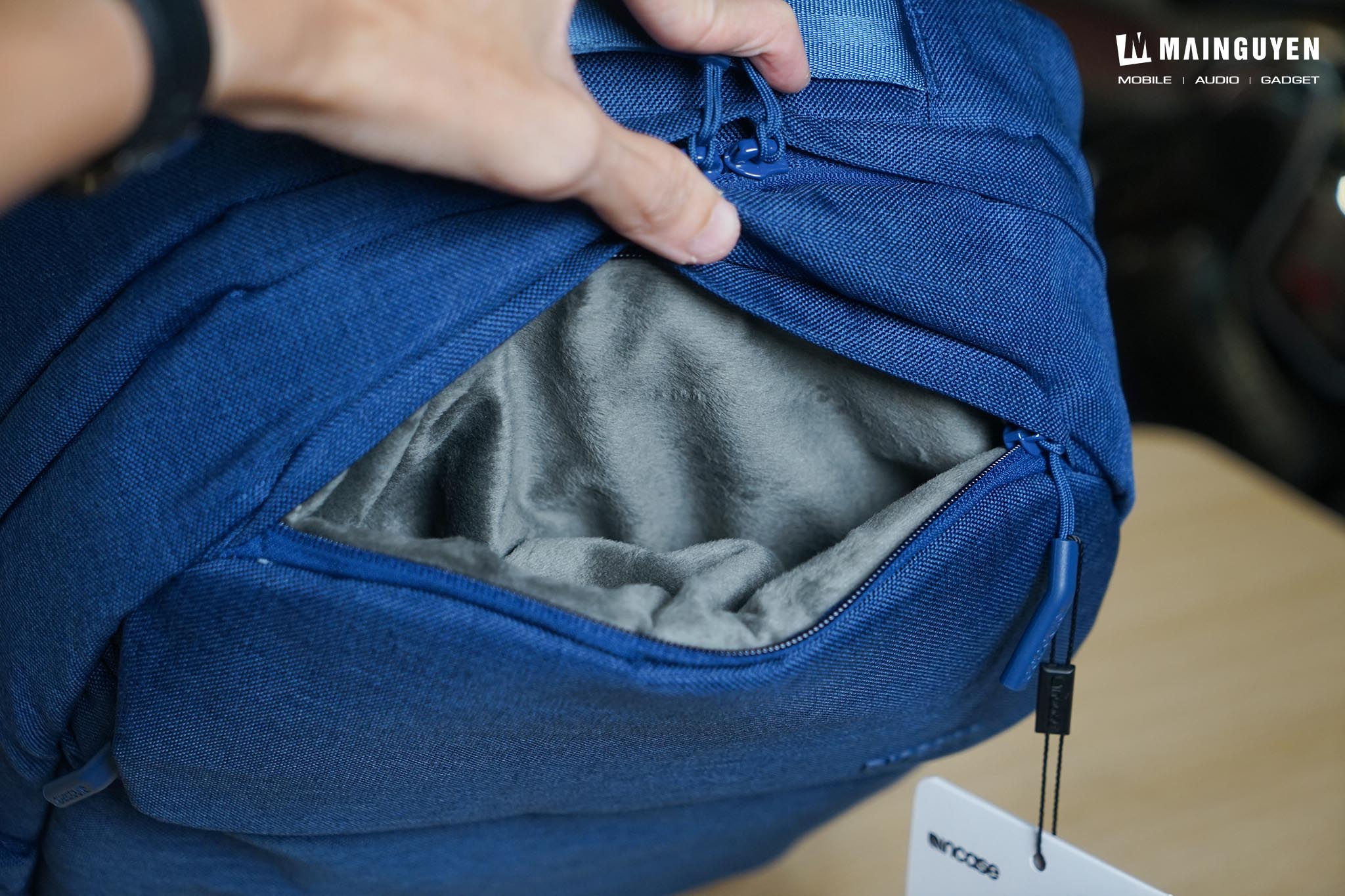 Ngăn đựng laptop kích thước tối đa 16-inch nằm áp sát lưng có đệm lót bên trong khá dầy, vải lót bằng lớp lông cừu giả (faux-fur) siêu mềm không chỉ chống sốc mà còn giúp tránh mọi vết trầy xước không mong muốn. Ngăn đựng máy tính bảng nói chung hoặc iPad nói riêng có đệm lót tương tự và tách biệt hẳn, giúp tránh va chạm giữa các thiết bị điện tử. Ngăn chính rộng rãi đủ chỗ cho một chồng tài liệu A4, sách vở, một chiếc áo khoác mỏng, hoặc thậm chí là vài bộ quần áo nếu bạn có một chuyến công tác ngắn ngày. Bên trong ngăn chính còn có các túi nhỏ, ngăn lưới và khe cắm bút, giúp bạn dễ dàng sắp xếp chuột, sạc, pin dự phòng, tai nghe và các vật dụng nhỏ khác một cách gọn gàng, tránh tình trạng đồ đạc lộn xộn dưới đáy balo.