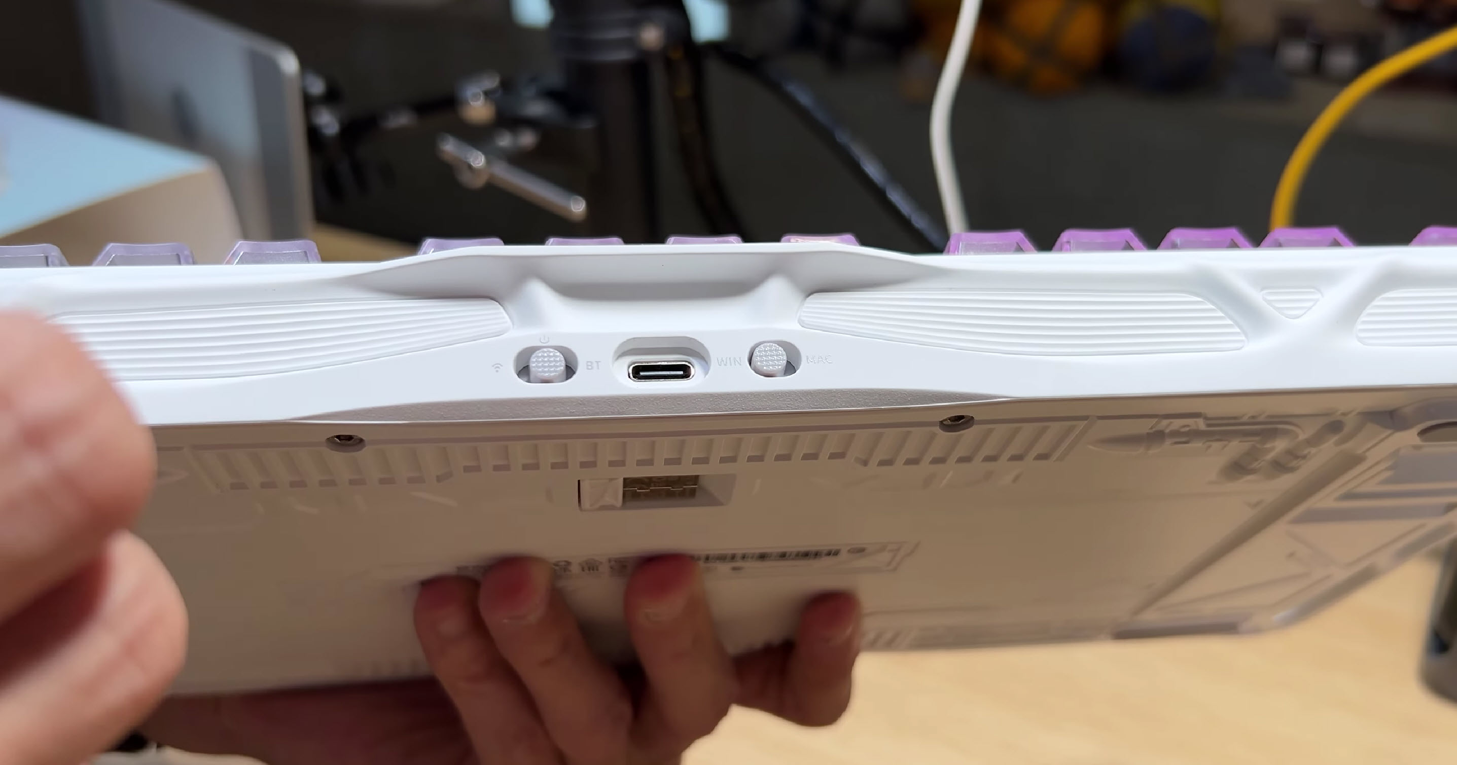 Cạnh trên bố trí cổng USB-C để sạc điện và sử dụng bàn phím ở dạng có dây, nút gạt để chuyển qua chế độ Bluetooth hoặc 2.4GHz, nút gạt để chuyển qua hai nền tảng hệ điều hành Windows hoặc MacOS.