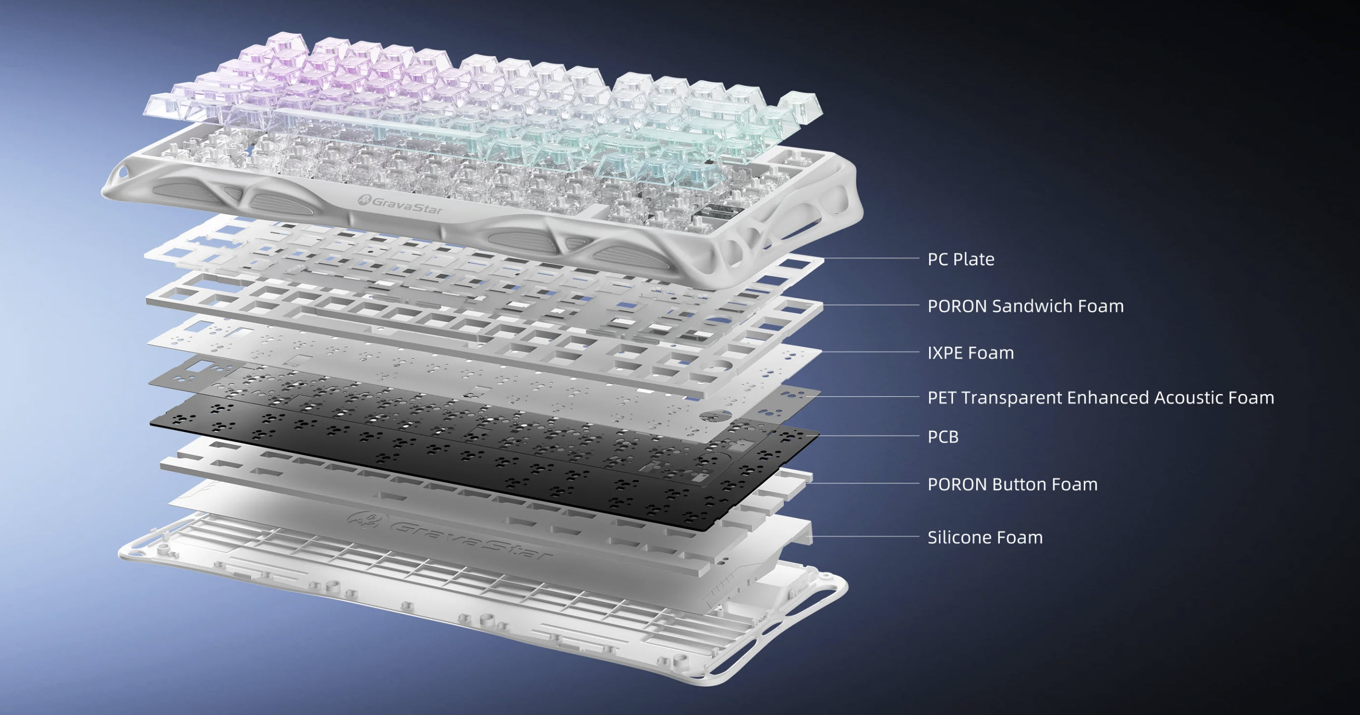 Và cũng giống như rất nhiều mẫu bàn phím cơ khác của Gravastar, K1 Lite Crystal Aurora cho cảm giác gõ êm ái và sướng tay là nhờ cấu trúc Gasket-mounted với hệ thống 5 lớp foam giảm âm được xếp chồng lên nhau giữa PCB (bảng mạch) và plate, cũng như giữa PCB và đáy vỏ. Các lớp foam này có tác dụng hấp thụ âm thanh giảm thiểu tiếng vang rỗng hoặc tiếng lạch cạch không mong muốn từ bên trong bàn phím. Đồng thời giảm chấn hấp thụ lực tác động khi gõ phím, giảm rung động truyền từ switch xuống vỏ bàn phím.