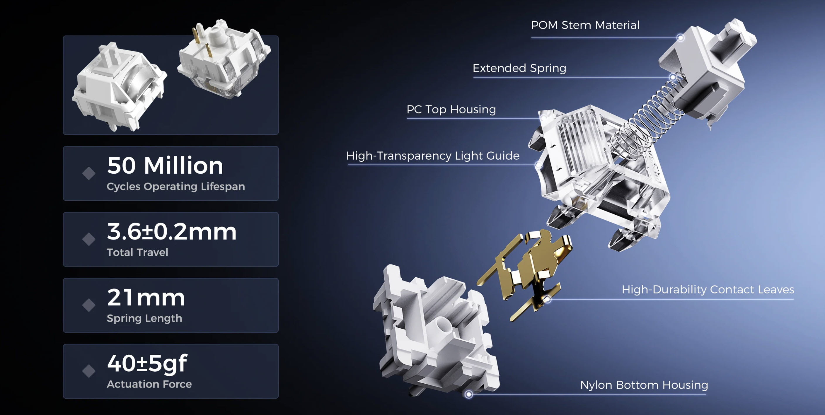 + Pre-lubed: Switch đã được nhà máy bôi trơn (lube) sẵn ở các điểm tiếp xúc và lò xo, giúp triệt tiêu tiếng ồn và mang lại sự mượt mà ngay khi mở hộp.