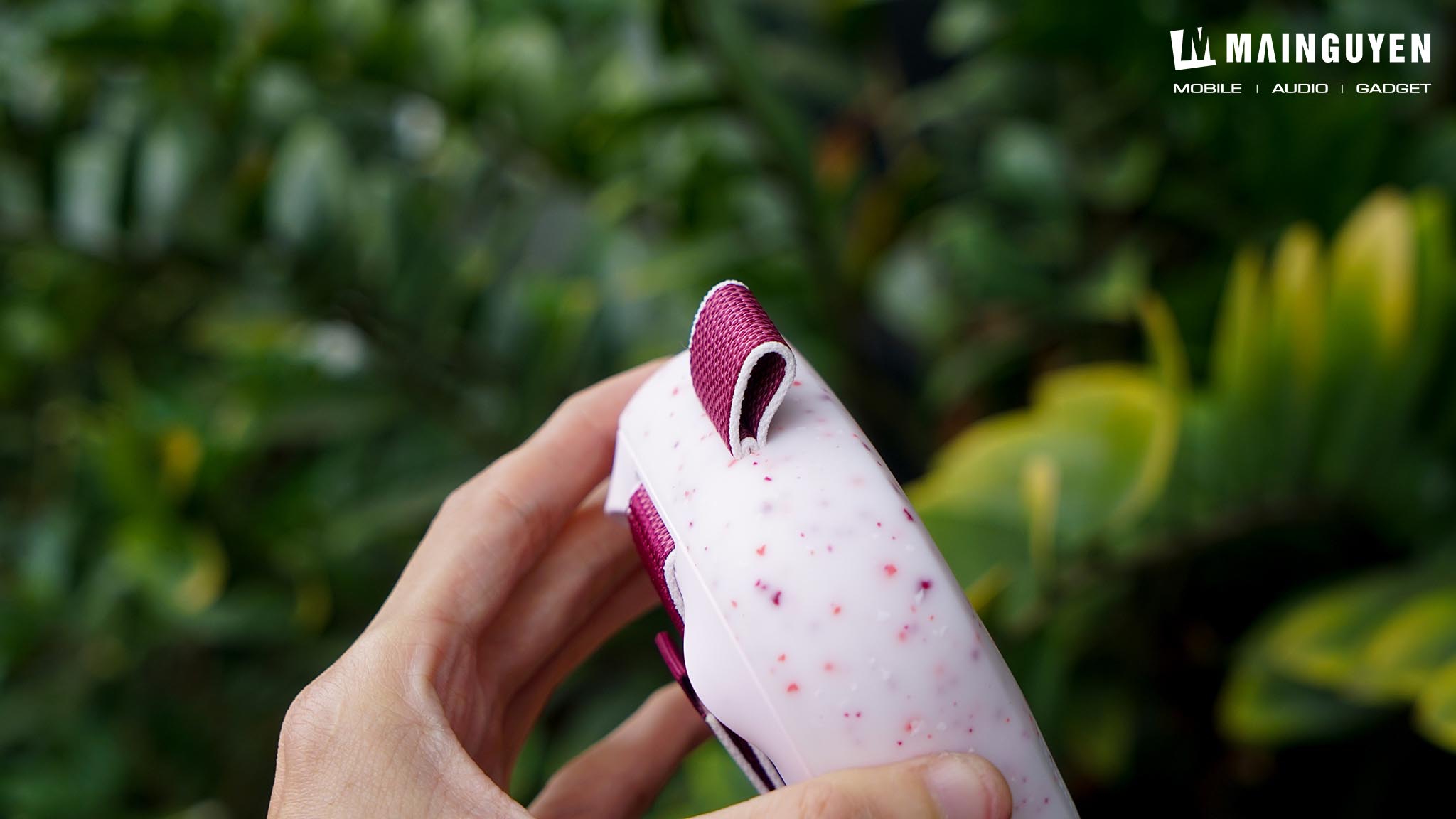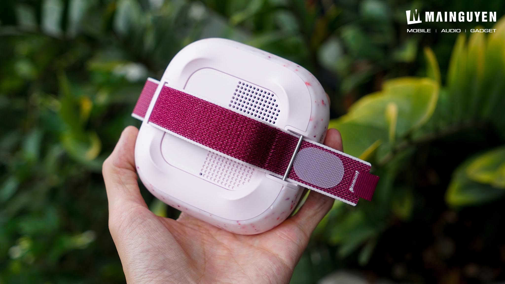 Điểm đổi mới tiếp theo trên SoundLink Micro Gen2 đó là khả năng treo, móc loa cố định trên ghi đông xe đạp, quai balo hay bất cứ đâu nhờ dây đai bằng chất liệu vải dệt cho độ co giãn nhất định và giữ chắc bằng khóa dán velcro, thay vì quai silicon mềm ở thế hệ trước. Điểm cộng là bạn sẽ giữ cố định loa SoundLink Micro Gen2 tốt hơn ở nhiều vị trí khác nhau, điểm trừ là sẽ thấm nước và sẽ bị xù vải sau một thời gian dài sử dụng.