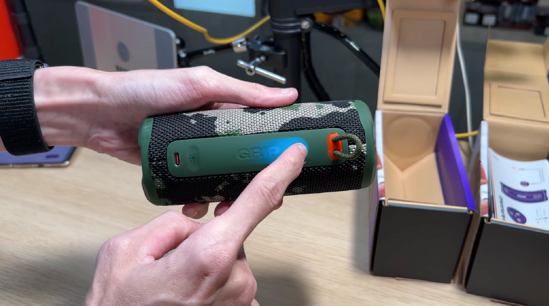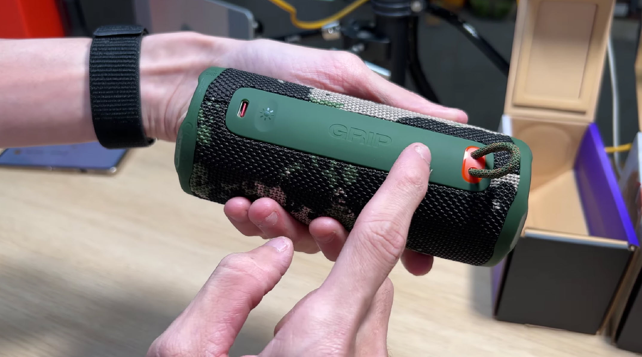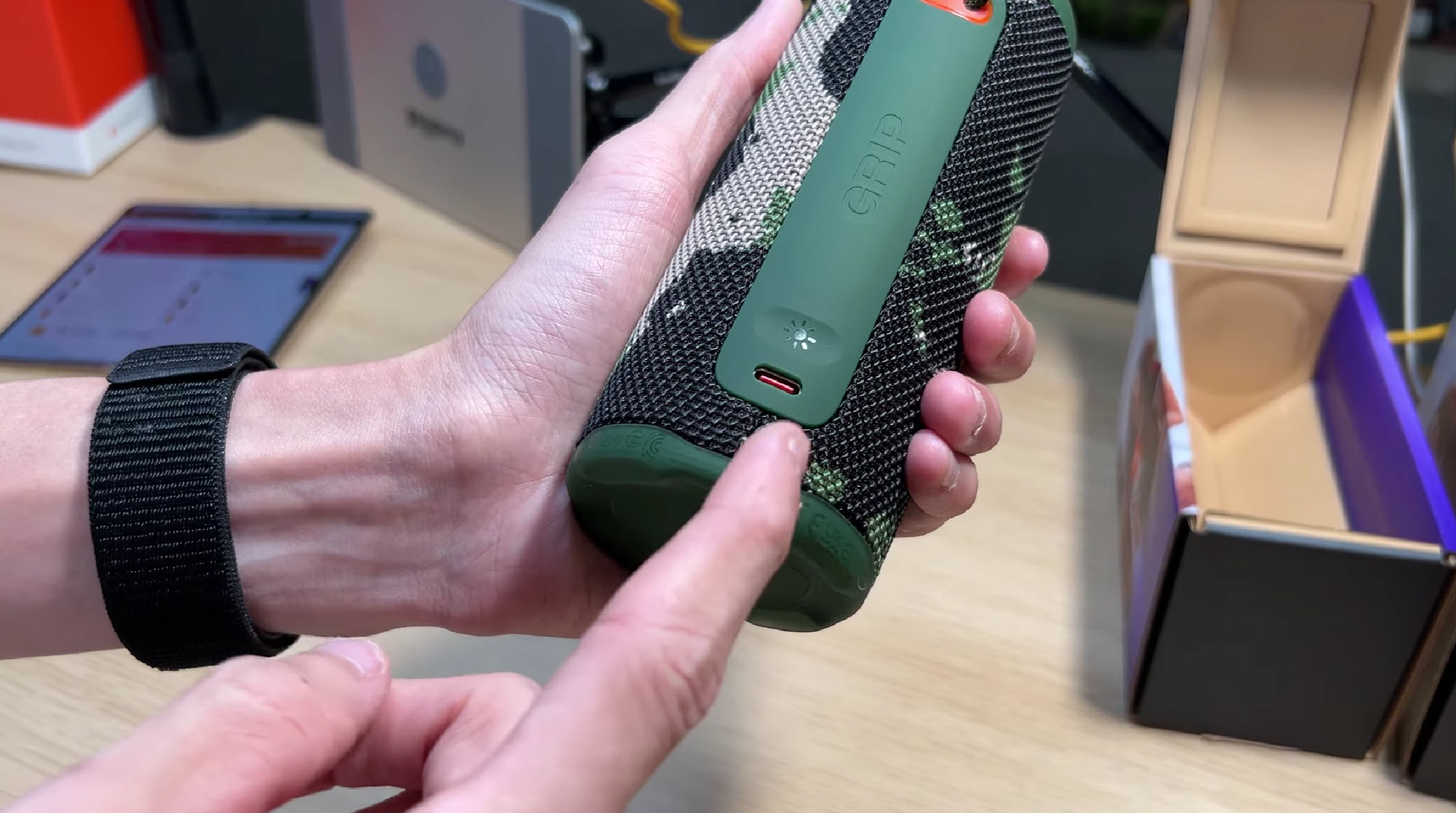 Mặt sau loa với khu vực silicon in tên sản phẩm, có thêm quai bằng vải bện khá dầy để bạn treo hoặc móc loa JBL Grip ở bất cứ đâu, cổng sạc USB-C và nút bấm để chuyển đổi các hiệu ứng đèn. Nhắc tới đèn thì JBL Grip được trang bị đèn nền Ambient Light được làm ẩn đi rất tinh tế rất tinh tế bên dưới dải silicon. Đèn nền Ambient Light không chỉ nháy theo nhạc mà còn đóng vai trò là đèn báo pin và trạng thái kết nối, mang lại vẻ hiện đại và công nghệ hơn hẳn so với mẫu JBL Flip 7.