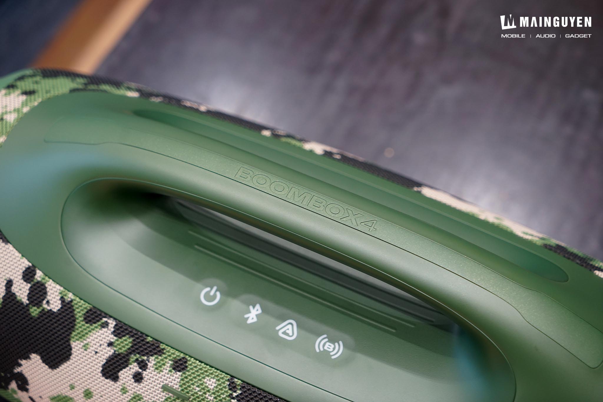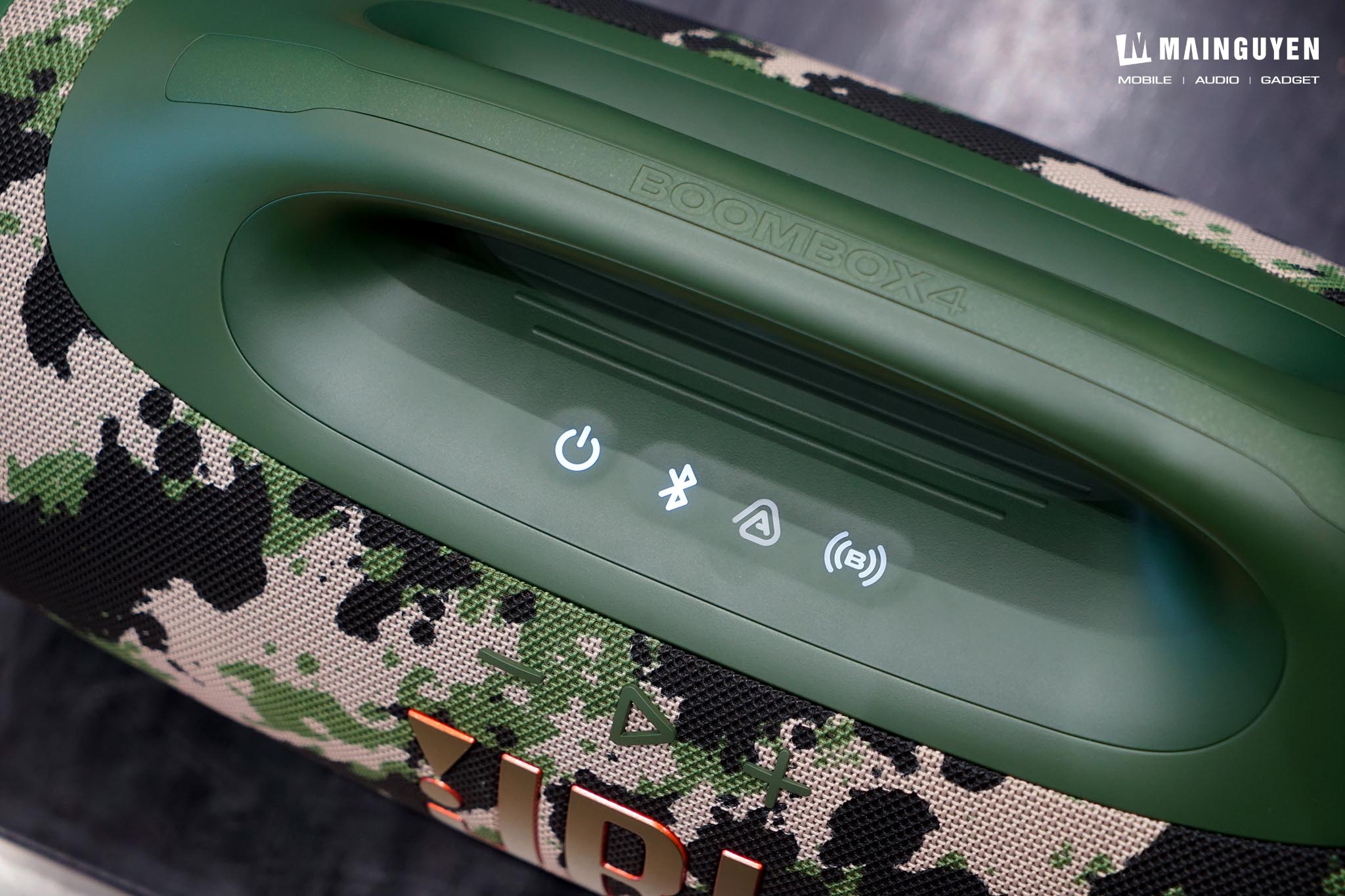 Phía trên loa Boombox 4 bố trí cụm nút bấm mềm để điều khiển các tính năng gồm: bật/tắt nguồn, pairing Bluetooth, tính năng Auracast và chế độ Dual Bass Boost hoàn toàn mới, bên dưới hàng nút bấm có đèn nền trắng giúp dễ thao tác trong điều kiện thiếu sáng. Khi không sử dụng chế độ Dual Bass Boost, đèn nền trên nút bấm sẽ không sáng, khi nhấn 1 lần, đèn nền sẽ sáng mờ đồng thời màng loa thụ động hai bên loa sẽ sáng đèn viền màu cam, và khi nhấn thêm 1 lần nữa thì đèn nền trên nút sẽ sáng hơn đồng thời đèn viền hai bên màng loa thụ động sẽ chuyển sang màu trắng. Chi tiết hơn, đèn màu cam là chế độ Deep Bass cho âm trầm đầy đặn, sâu lắng, phù hợp với các dòng nhạc cần độ dày, còn đèn màu trắng là chế độ Punchy Bass cho âm trầm gọn, chắc và sôi động hơn, lý tưởng cho những bản nhạc tiết tấu nhanh, mạnh mẽ.