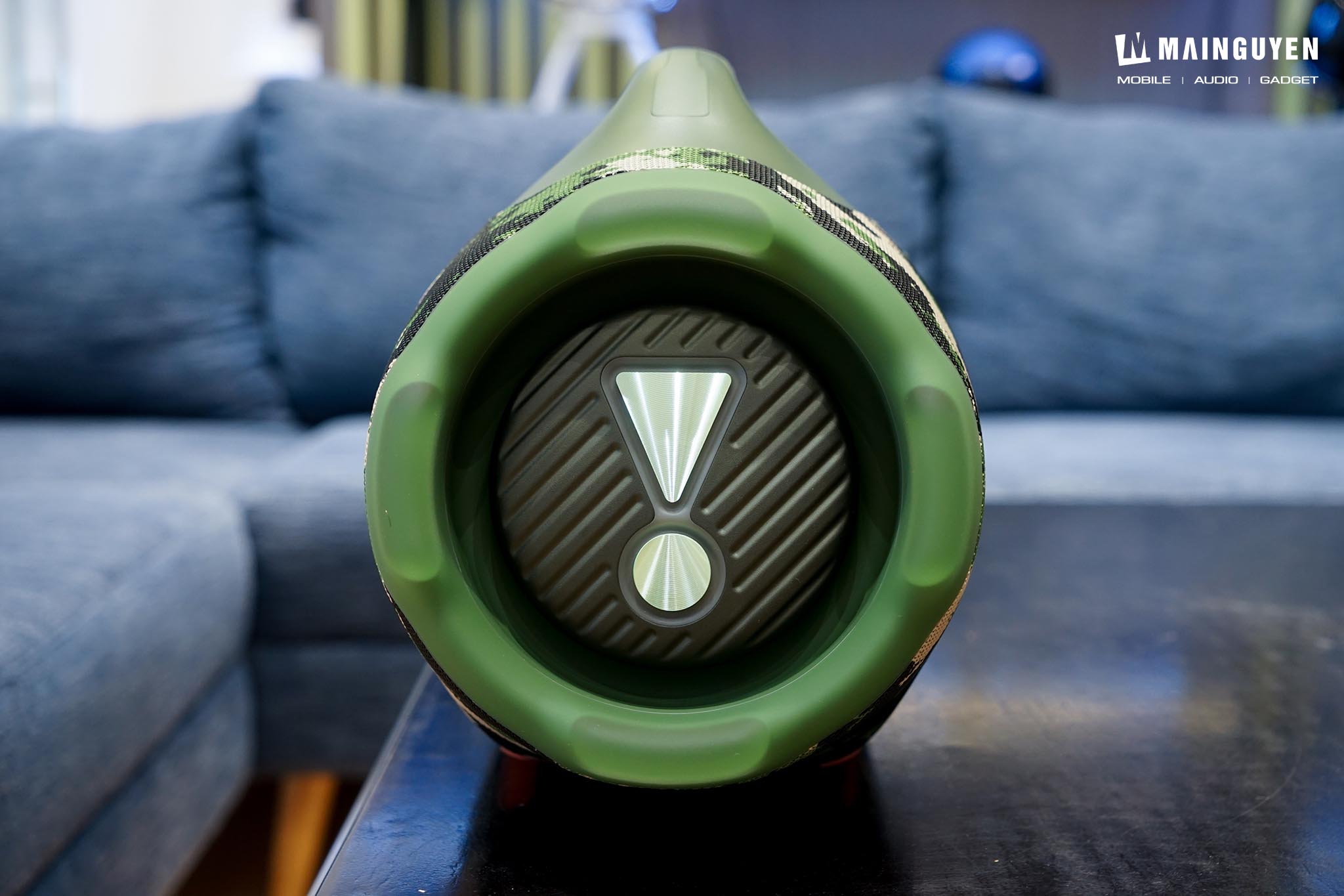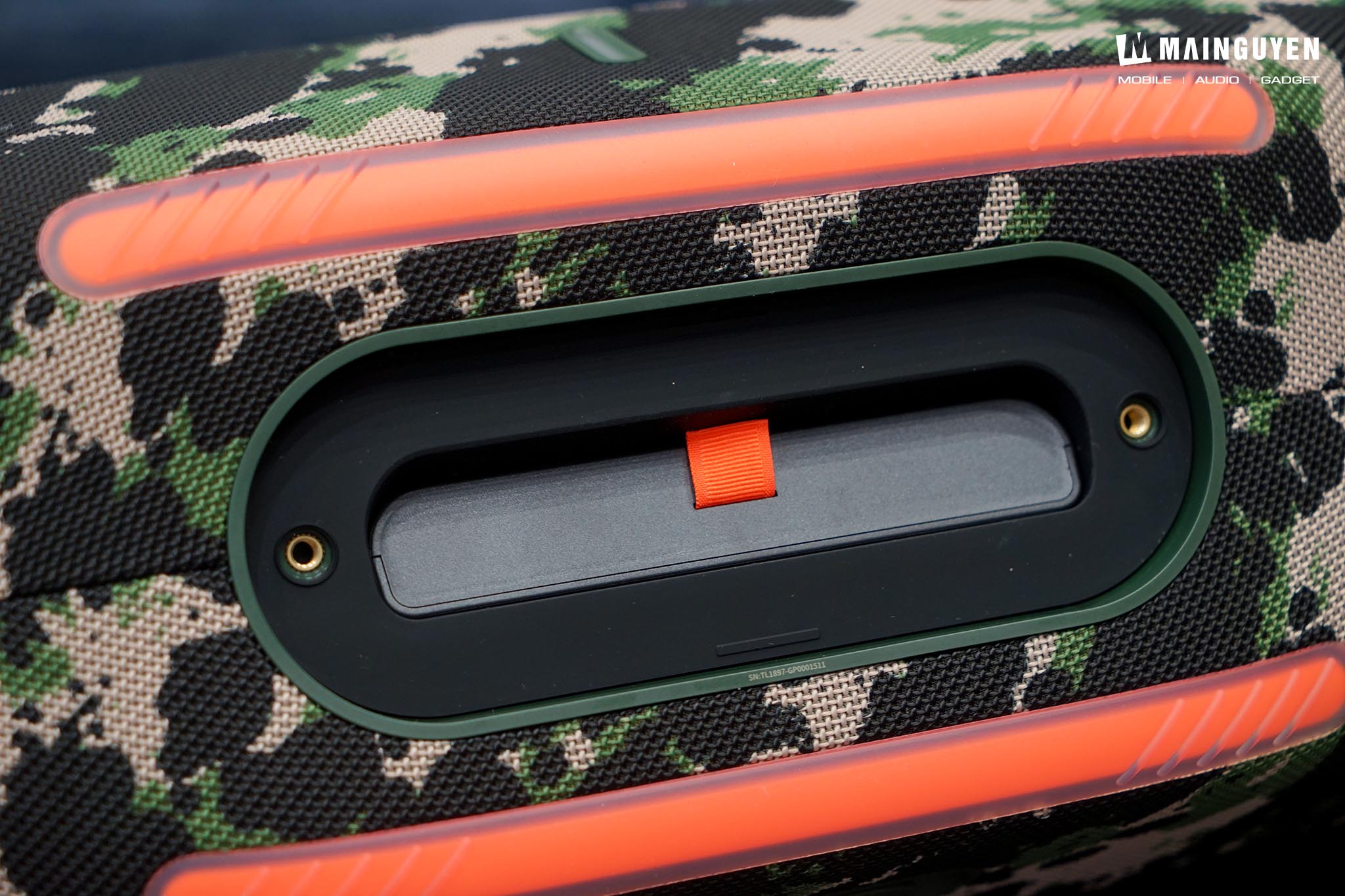 Phía sau loa bố trí cổng cấp nguồn chân số 8 và cổng USB-C với hai tính năng, một là để sạc ngược cho thiết bị di động, hai là truyền tín hiệu âm thanh khi bạn dùng cáp hai đầu USB-C kết nối với loa và PC hoặc laptop. Điểm lưu ý là sợi cáp USB-C phải hỗ trợ truyền dữ liệu, không hỗ trợ nhận USB xài cổng USB-C. Hai cổng được che đậy kính bằng nắp silicon dầy để đảm bảo tính chống nước và bụi bẩn.