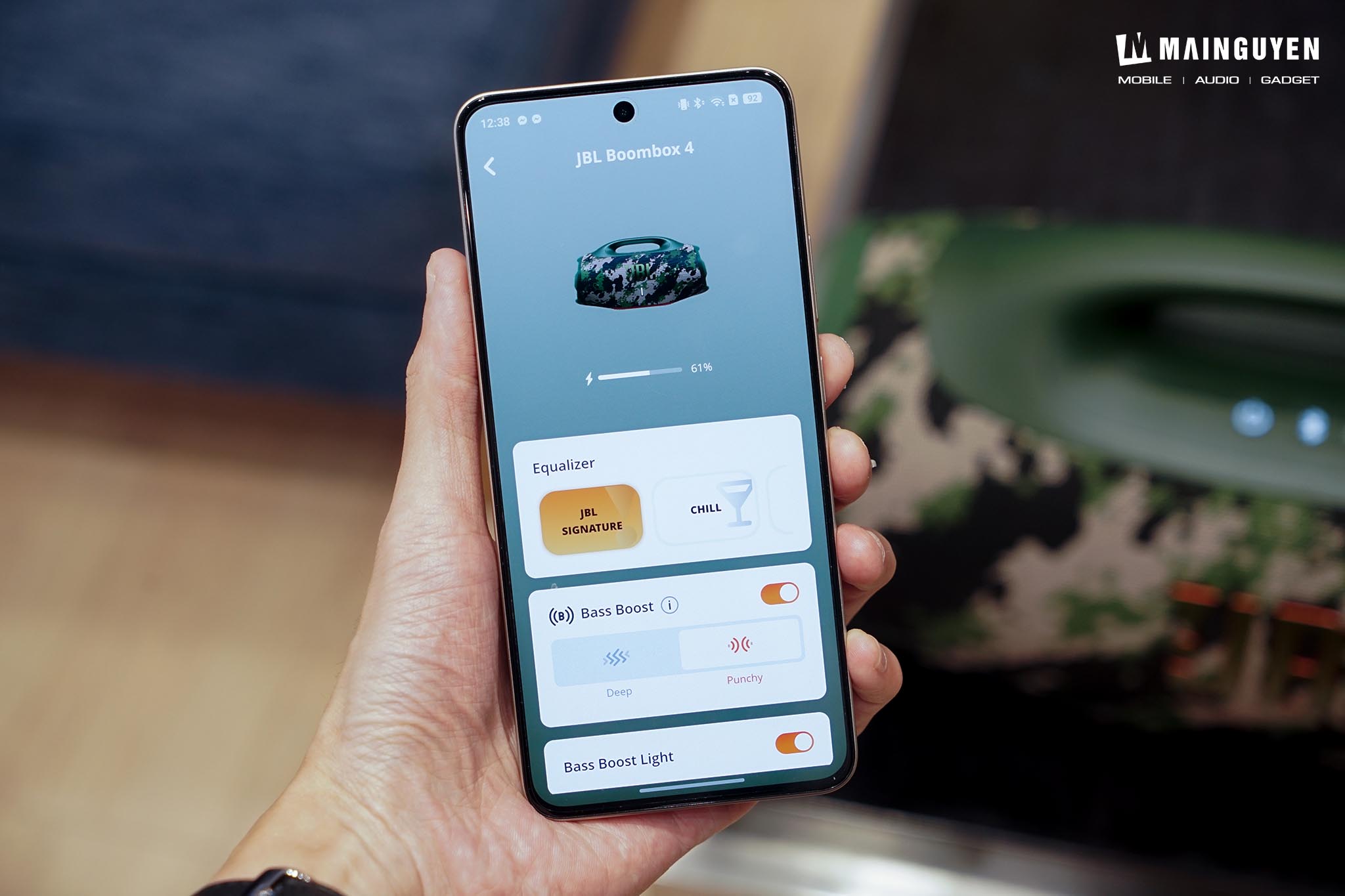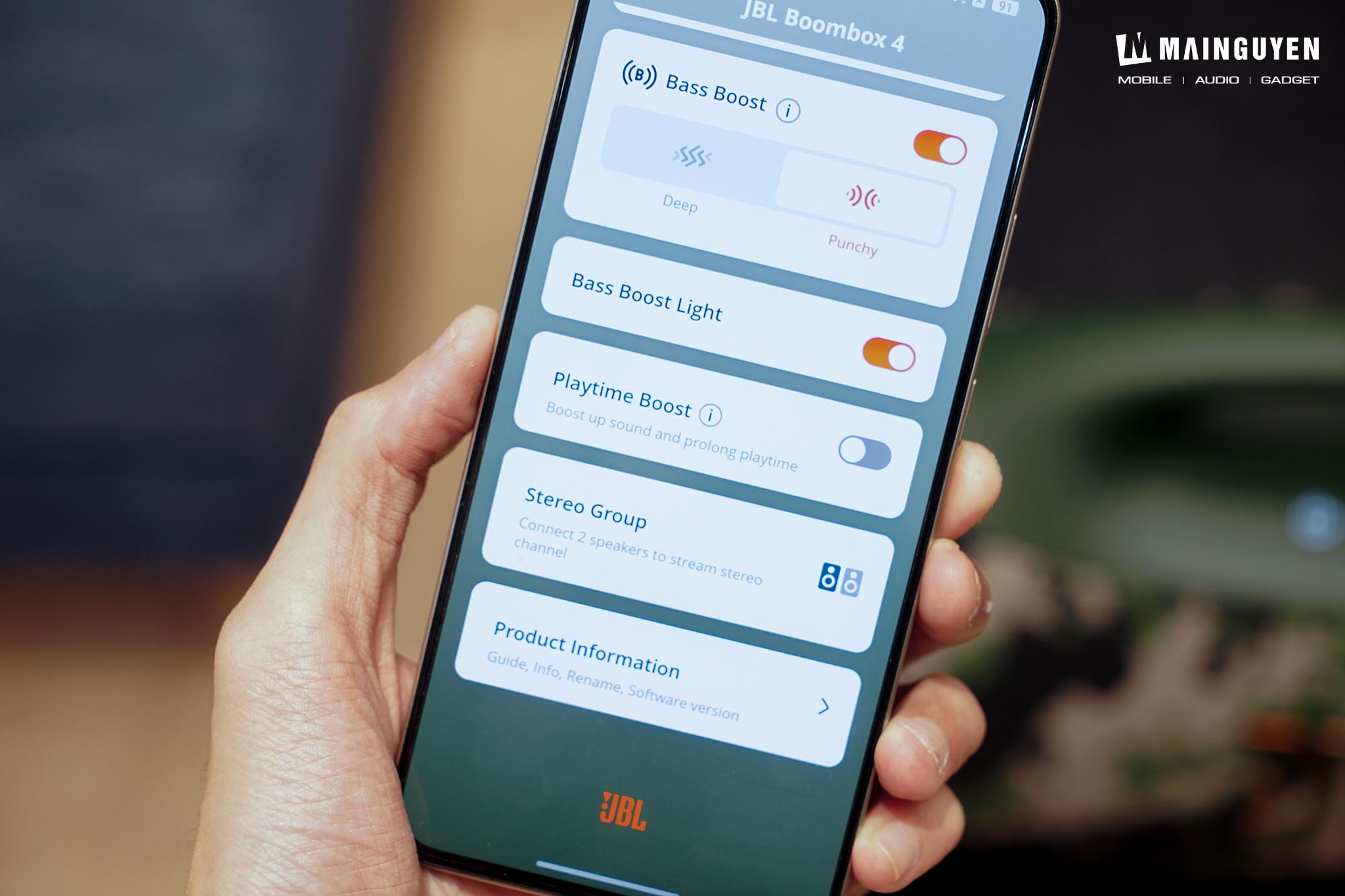 Và tất nhiên không thể quên việc kết nối với app JBL Portable để bạn có những tùy chỉnh khác như EQ, cập nhật firmware mới nhất nếu có, ghép loa không dây,…. Tổng kết nhanh, Boombox 4 là một bản nâng cấp toàn diện và xứng đáng. Nó không chỉ là chiếc loa di động lớn nhất và mạnh mẽ nhất của JBL, mà còn là một thiết bị thông minh hơn, nhẹ hơn và bền bỉ hơn, sẵn sàng khuấy động mọi cuộc vui. Công suất lớn, AI Sound Boost, Bass Boost kép và pin 34 giờ cùng khả năng thay pin là những điểm cộng lớn khiến Boombox 4 trở thành "quái vật" âm thanh ngoài trời thế hệ mới.