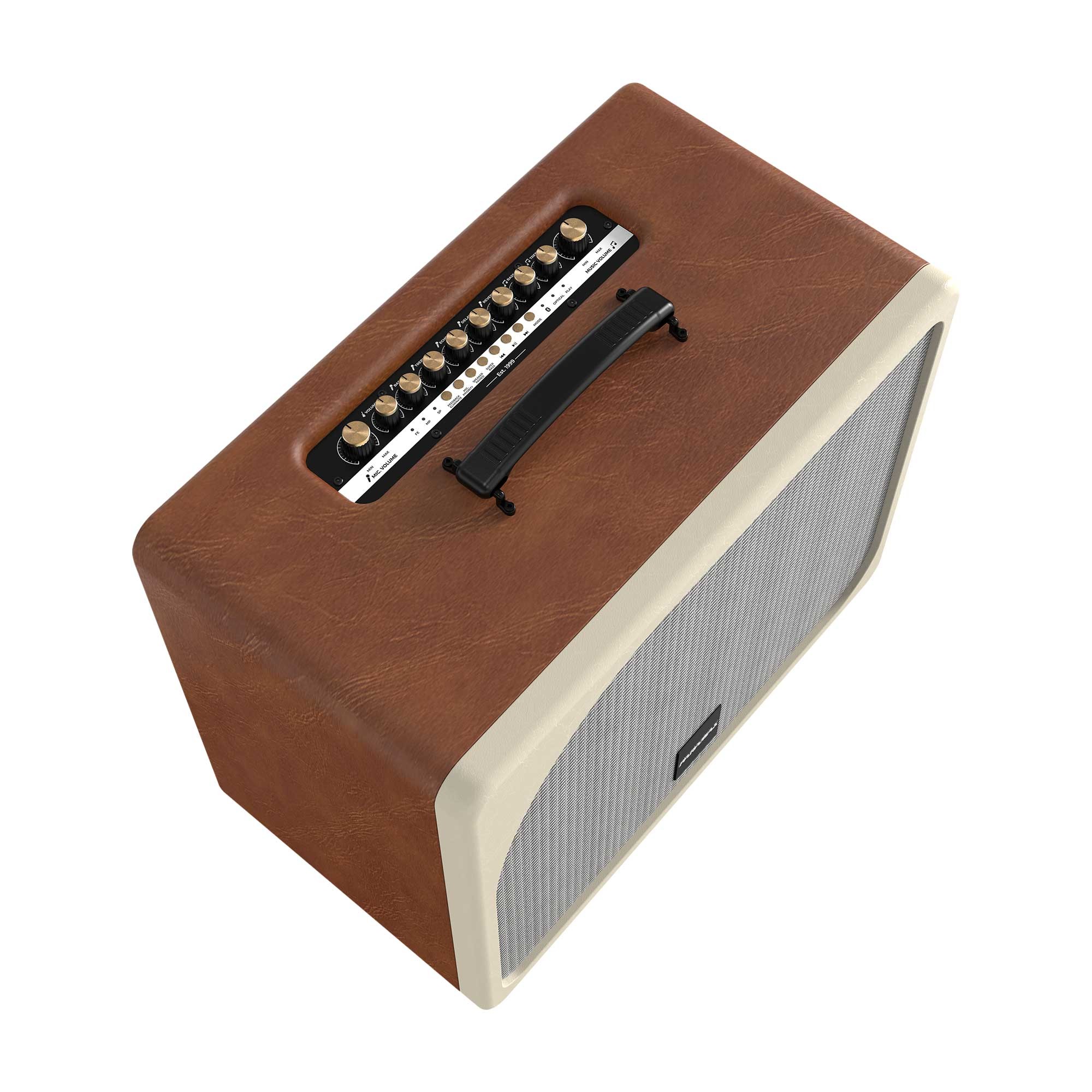 Loa karaoke Evox có độ hoàn thiện tốt và chắn chắn, chất liệu nhựa mềm có họa tiết vân giả da bề mặt kết hợp phần lưới bảo vệ màng loa bên trong mang đến sự cao cấp nhất định. Phía trên sẽ có phần quai xách để thuận tiện khi di chuyển.