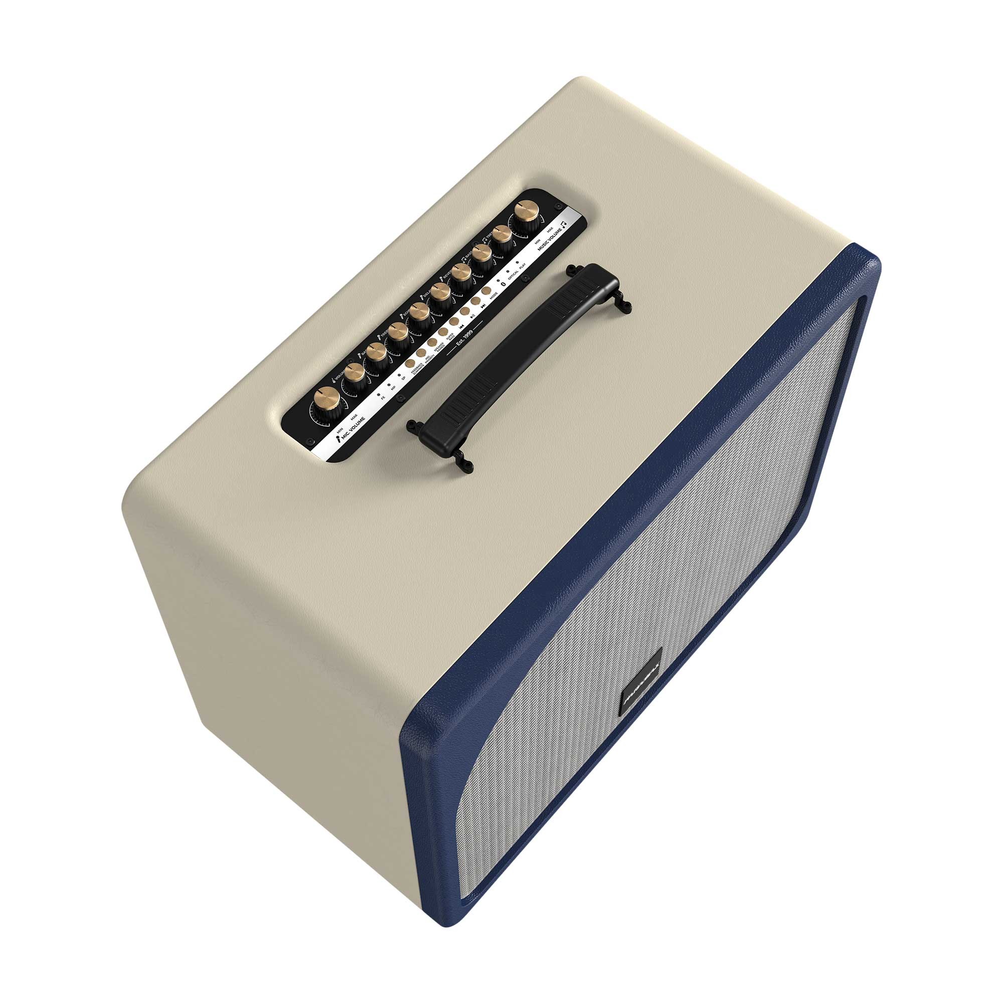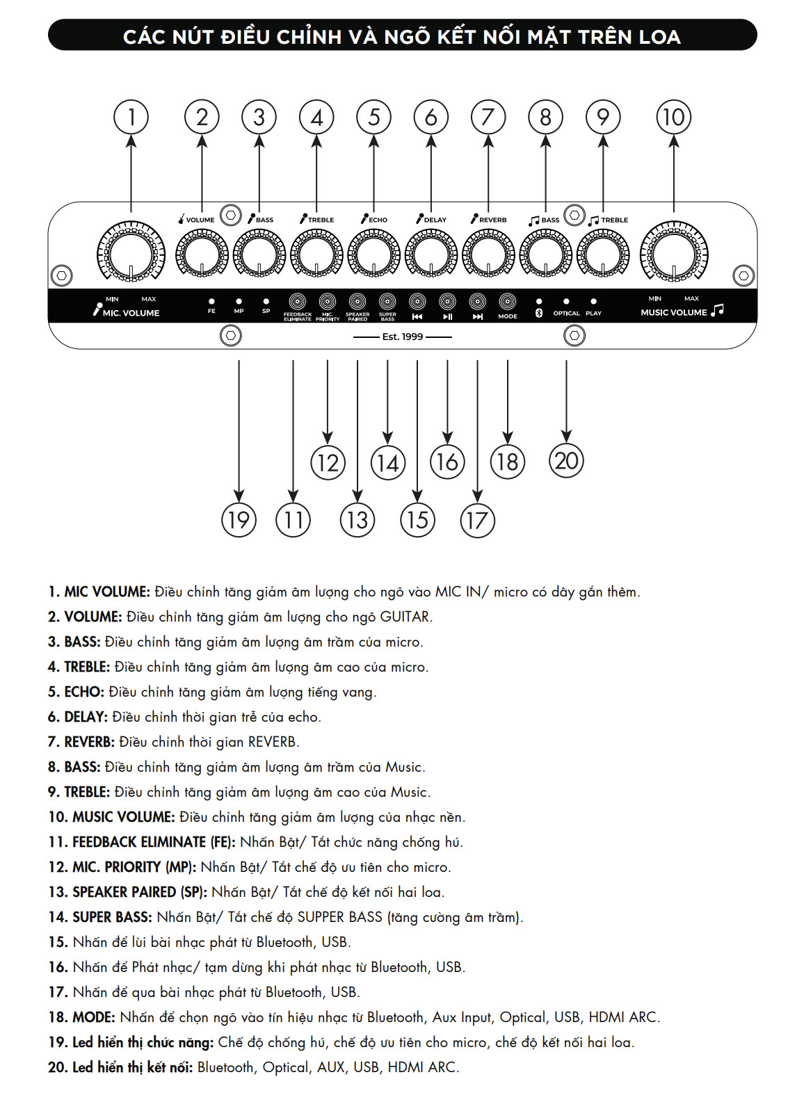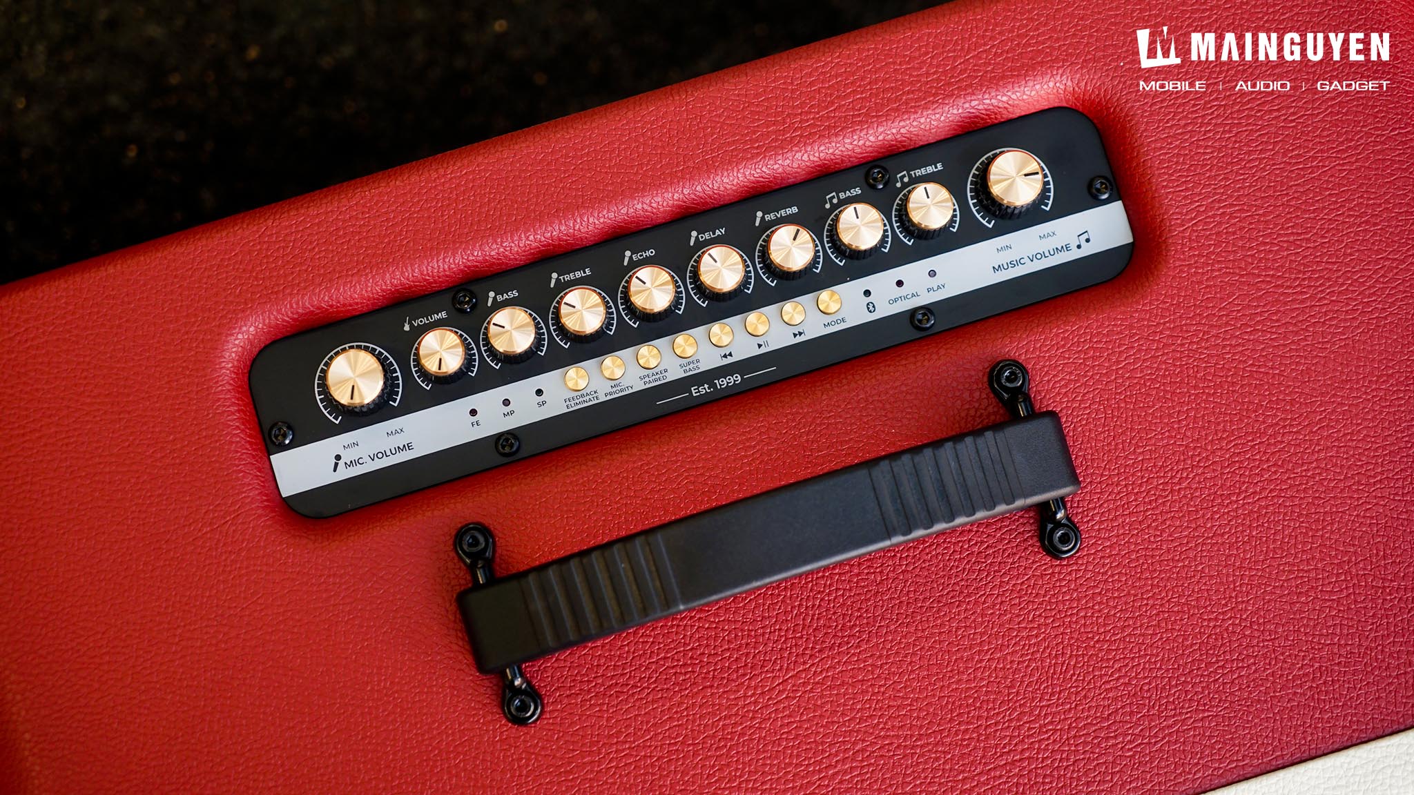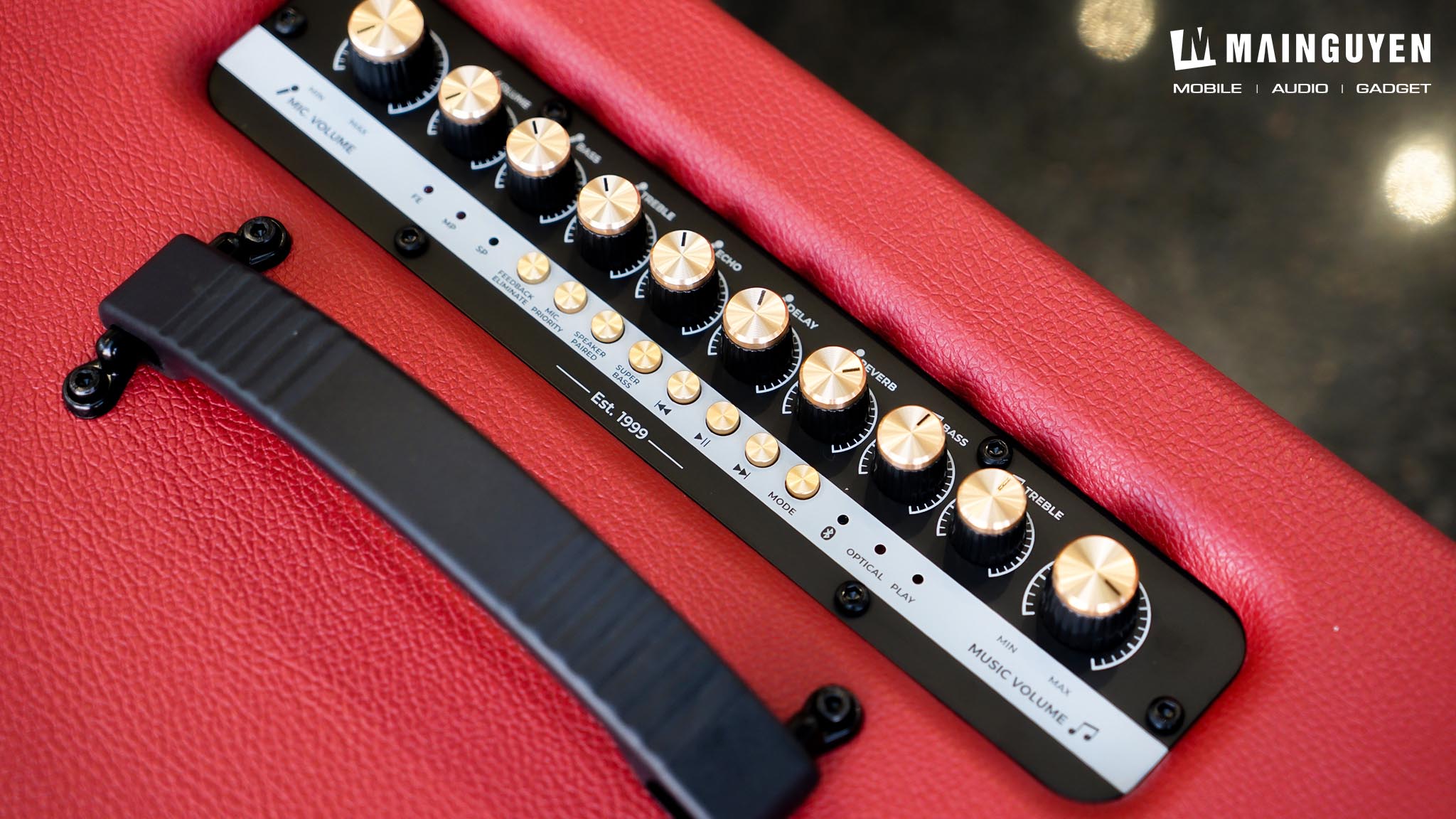 Phía trên sẽ là hàng nút núm vặn để điều chỉnh tất cả những tính năng liên quan đến âm thanh của loa, micro không dây và đàn guitar khi kết nối. Riêng hàng nút bấm cứng nhỏ để bạn điều chỉnh các tính năng cơ bản như: chơi/ngừng/chuyển/tua bài hát, tăng cường dải âm bass, ghép hai loa không dây PASION Evo, đèn thông báo ngõ vào kết nối,… Điểm hạn chế ở khu vực điều khiển chính là không có đèn nền, thế nên sẽ hơi khó thao tác khi sử dụng trong điều kiện ban đêm.