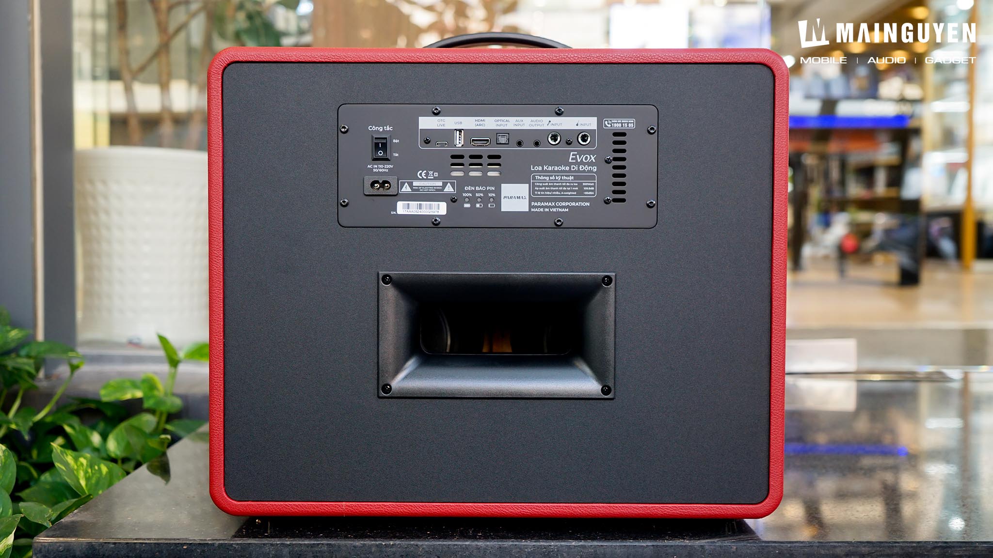 Phía sau của loa karaoke Evox với lỗ thoát hơi dải âm trầm (âm bass) và các cổng kết nối được bố trí rất gọn gàng và chỉnh chu. Công tắc được làm khá to để dễ thao tác, có hẳn đèn báo kèm biểu tượng và chữ minh họa để nhận biết nhanh trên từng cổng kết nối. Loa karaoke Evox hỗ trợ nhiều phương thức kết nối, bao gồm Bluetooth 5.3, HDMI ARC, Optical, AUX và USB, giúp bạn dễ dàng kết nối loa với nhiều thiết bị khác nhau như điện thoại, máy tính bảng, TV, máy tính,... Ngoài ra, loa karaoke di động PASION Evo còn có cổng kết nối Guitar và cổng live stream. Điểm thú vị là mỗi khi khởi động, kết nối với thiết bị mới hoặc thay đổi nguồn phát thì loa sẽ phát ra thông báo bằng tiếng Việt, như vậy để cả người lớn tuổi cũng có thể sử dụng loa karaoke Evox rất dễ dàng.