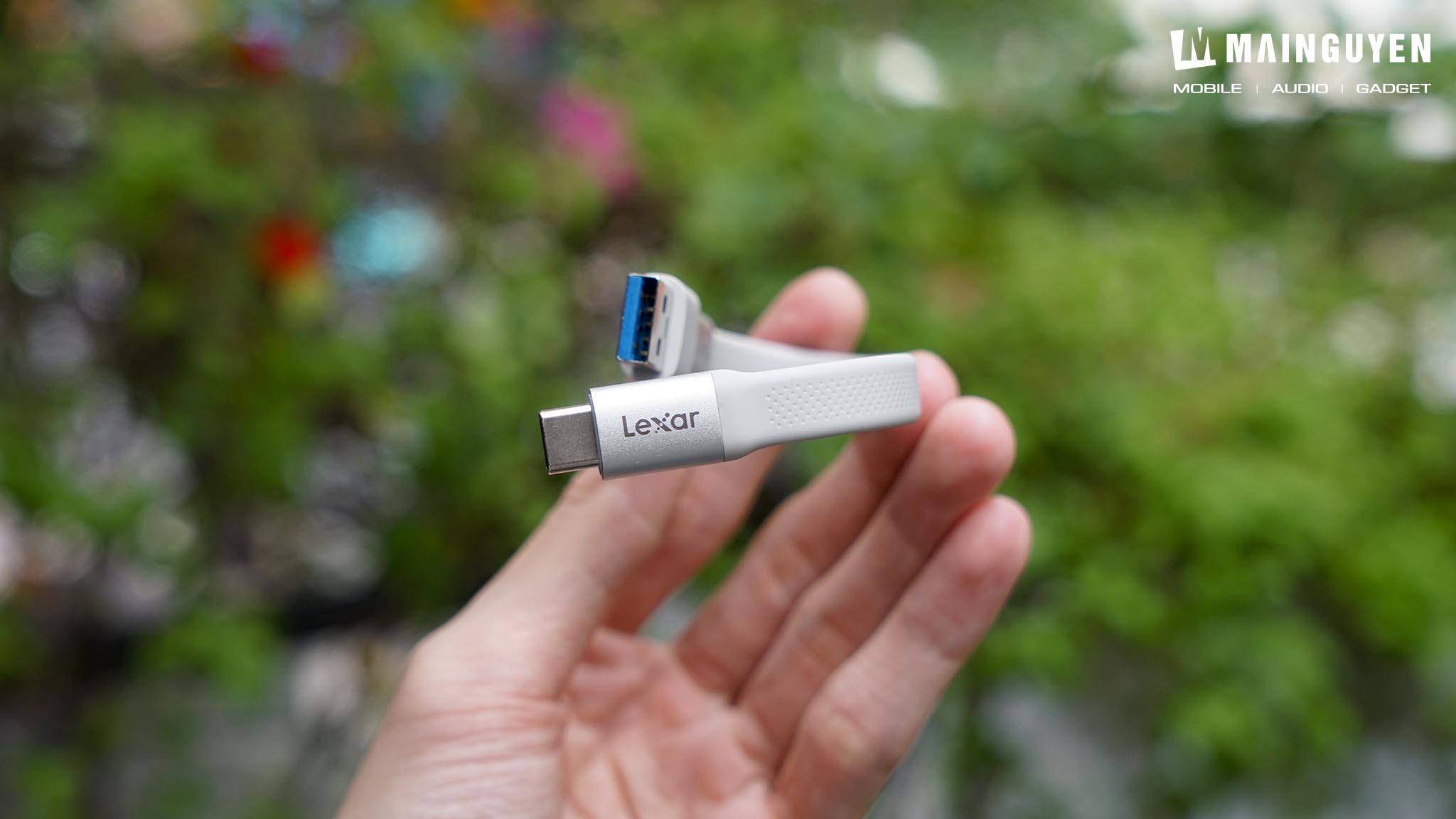 Phụ kiện quan trọng nhất là sợi cáp hai đầu USB-C có độ dài khoảng 20cm, hoàn thiện rất xịn với silicon mềm bọc bên ngoài khá dầy, hai đầu kết nối bọc vỏ kim loại. Nếu bạn sử dụng trên PC, laptop, thiết bị Android hoặc iPhone 15 series trở lên thì sẽ dùng giao thức kết nối USB-C, còn nếu thiết bị của bạn chỉ có cổng USB-A thì Lexar cũng trang bị sẵn adapter chuyển từ USB-C sang USB-A để sử dụng. Tiếc là hãng lại không có thêm adapter để chuyển sang cổng Lightning cho các thế hệ iPhone cũ hơn.