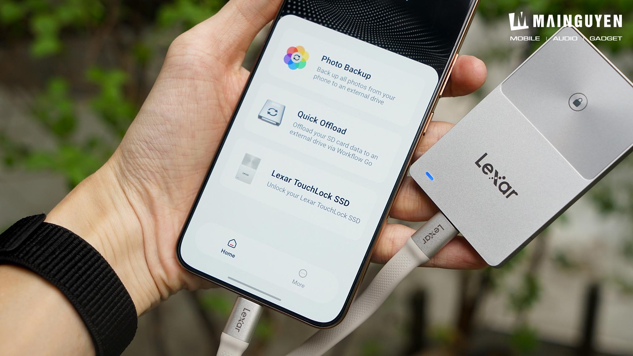 Để sử dụng, đầu tiên bạn cần phải bật tính năng NFC trên thiết bị di động muốn kết nối với ổ SSD, sau đó bạn tải app có tên Lexar, hỗ trợ cả nền tảng Android và iOS, cắm sợi cáp để kết nối. Tại giao diện chính của app, bạn chọn dòng Lexar TouchLock SSD.