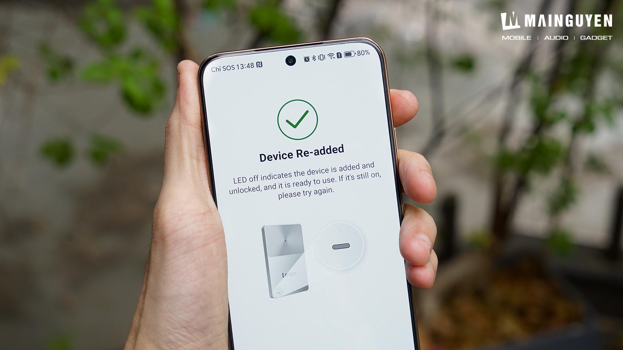 Tiếp đến, bạn sẽ đặt sát khu vực có biểu tượng ổ khóa trên ổ SSD vào mặt lưng của thiết bị di động, tùy từng hãng mà chip NFC sẽ bố trí khác nhau. Khi đã nhận diện, giao diện sẽ bắt đầu đếm ngược đến khi hiện thông báo thành công, đồng thời tín hiệu đèn trên ổ SSD sẽ tắt hẳn. Nếu đèn còn sáng, tức ổ SSD vẫn chưa được mở khóa và bạn sẽ phải kiểm tra lại thao tác chạm giữ NFC.