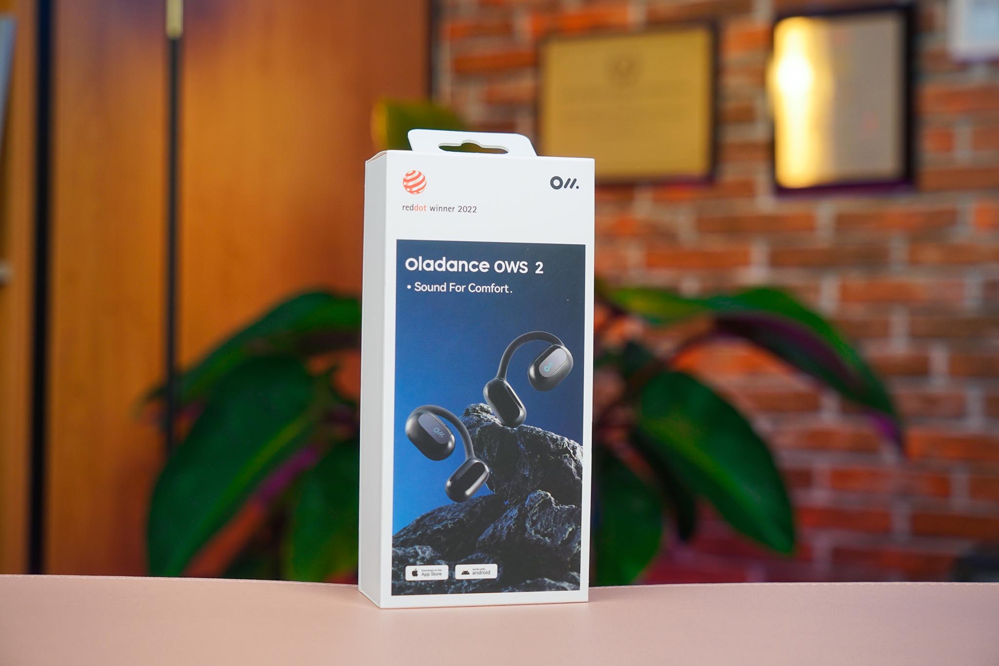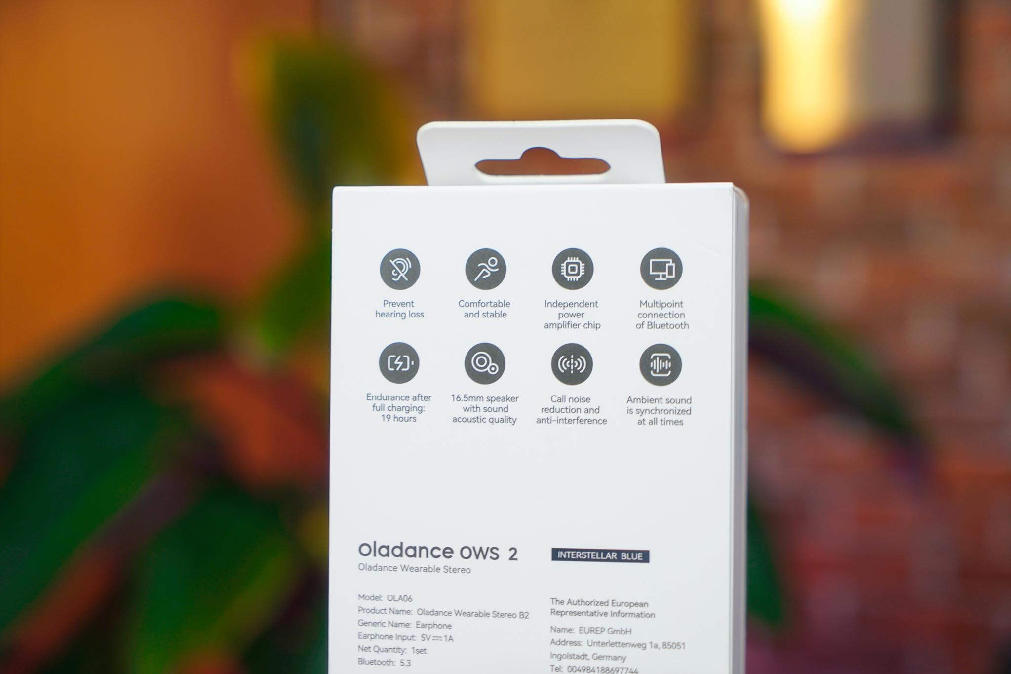 Kiểu đóng hộp sản phẩm của Oladance rất gọn với tên và ảnh minh họa được in nổi bật ở mặt trước, mặt sau sẽ là các thông số về trang bị tính năng nổi bật trên tai nghe. Thiết kế độc đáo của Oladance OWS 2 cũng giành được giải thưởng reddot winner 2022 danh giá.