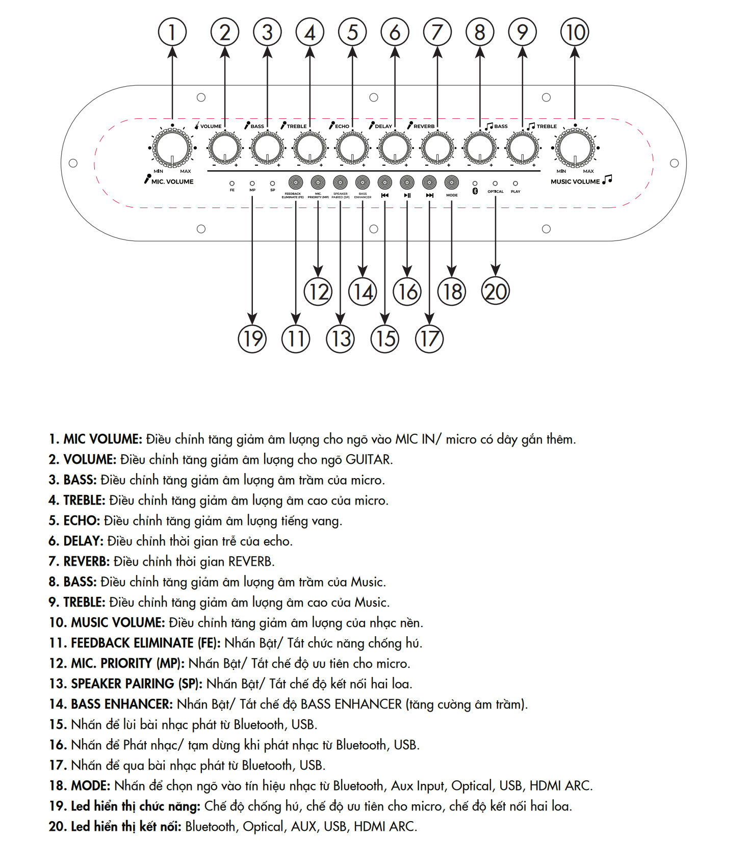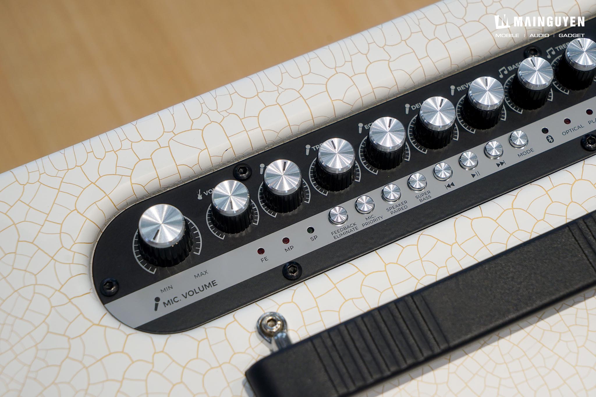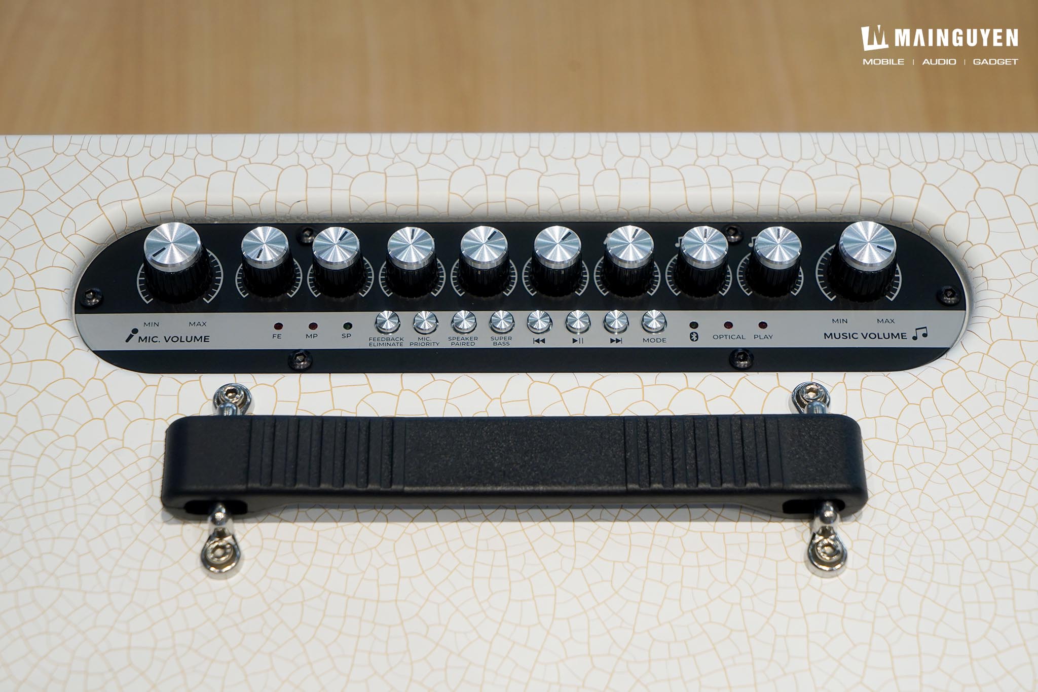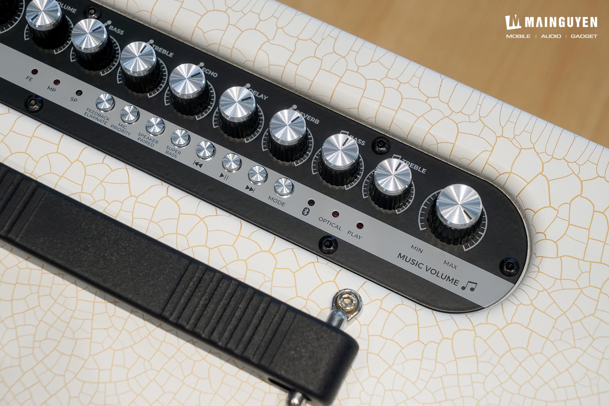 Phía trên sẽ là hàng nút núm vặn để điều chỉnh tất cả những tính năng liên quan đến âm thanh của loa, micro không dây và đàn guitar khi kết nối. Riêng hàng nút bấm cứng nhỏ để bạn điều chỉnh các tính năng cơ bản như: chơi/ngừng/chuyển/tua bài hát, tăng cường dải âm bass, ghép hai loa không dây PASION Arte, đèn thông báo ngõ vào kết nối,… Điểm hạn chế ở khu vực điều khiển chính là không có đèn nền, thế nên sẽ hơi khó thao tác khi sử dụng trong điều kiện ban đêm.