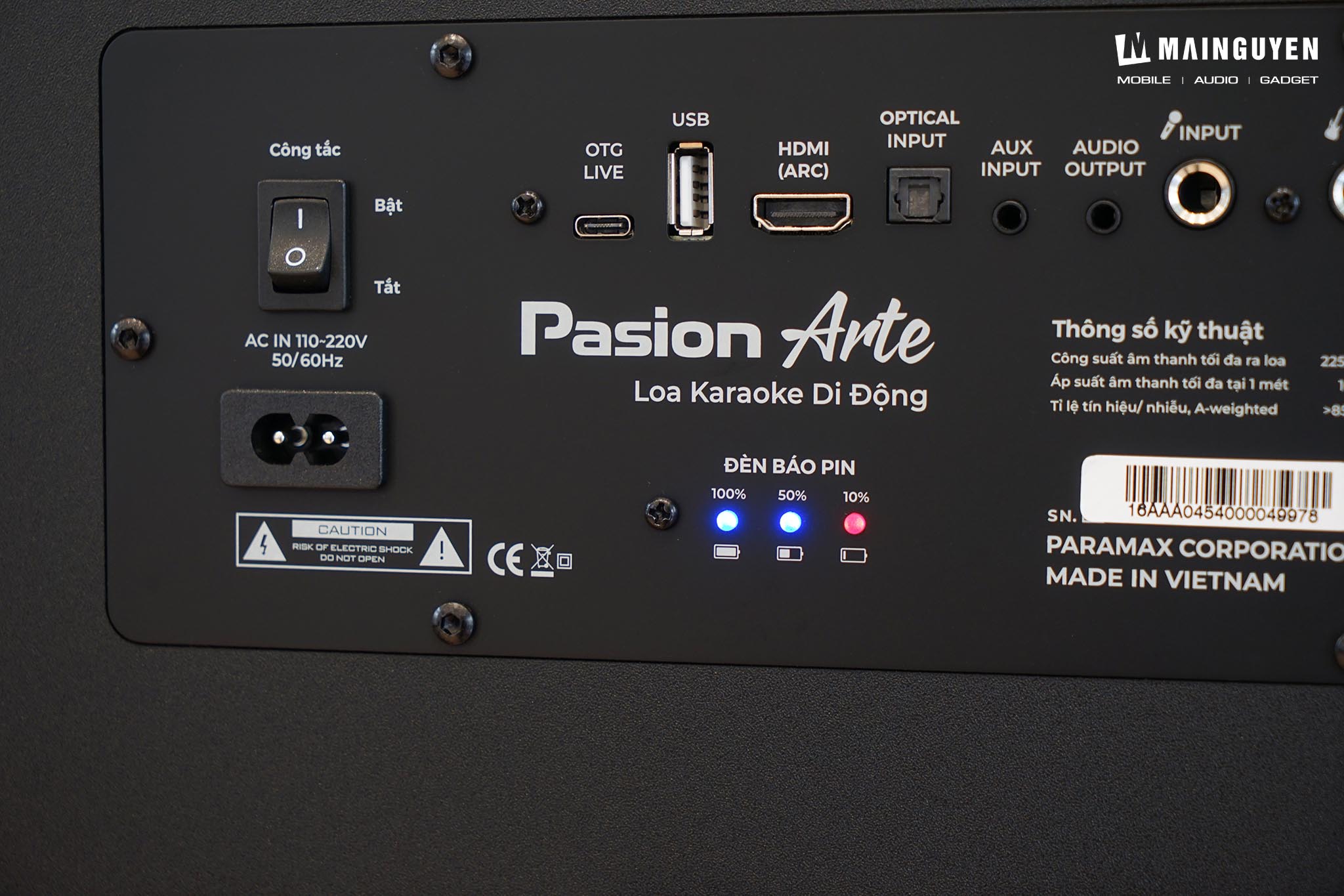 Phía sau của loa karaoke di động PASION Arte với hai lỗ thoát hơi dải âm trầm (âm bass) và các cổng kết nối được bố trí rất gọn gàng và chỉnh chu. Công tắc được làm khá to để dễ thao tác, có hẳn đèn báo kèm biểu tượng và chữ minh họa để nhận biết nhanh trên từng cổng kết nối. Loa karaoke di động PASION Arte hỗ trợ nhiều phương thức kết nối, bao gồm Bluetooth 5.3, HDMI ARC, Optical, AUX và USB, giúp bạn dễ dàng kết nối loa với nhiều thiết bị khác nhau như điện thoại, máy tính bảng, TV, máy tính,... Ngoài ra, loa karaoke di động PASION Arte còn có cổng kết nối Guitar và cổng live stream. Điểm thú vị là mỗi khi khởi động, kết nối với thiết bị mới hoặc thay đổi nguồn phát thì loa sẽ phát ra thông báo bằng tiếng Việt, như vậy để cả người lớn tuổi cũng có thể sử dụng loa karaoke di động PASION Arte rất dễ dàng.