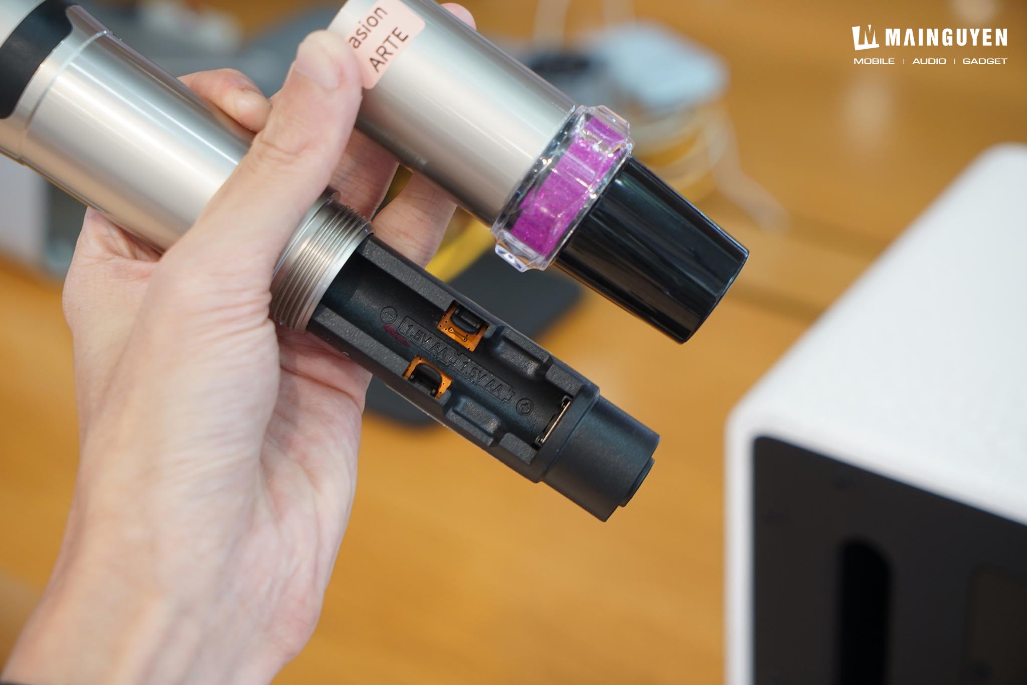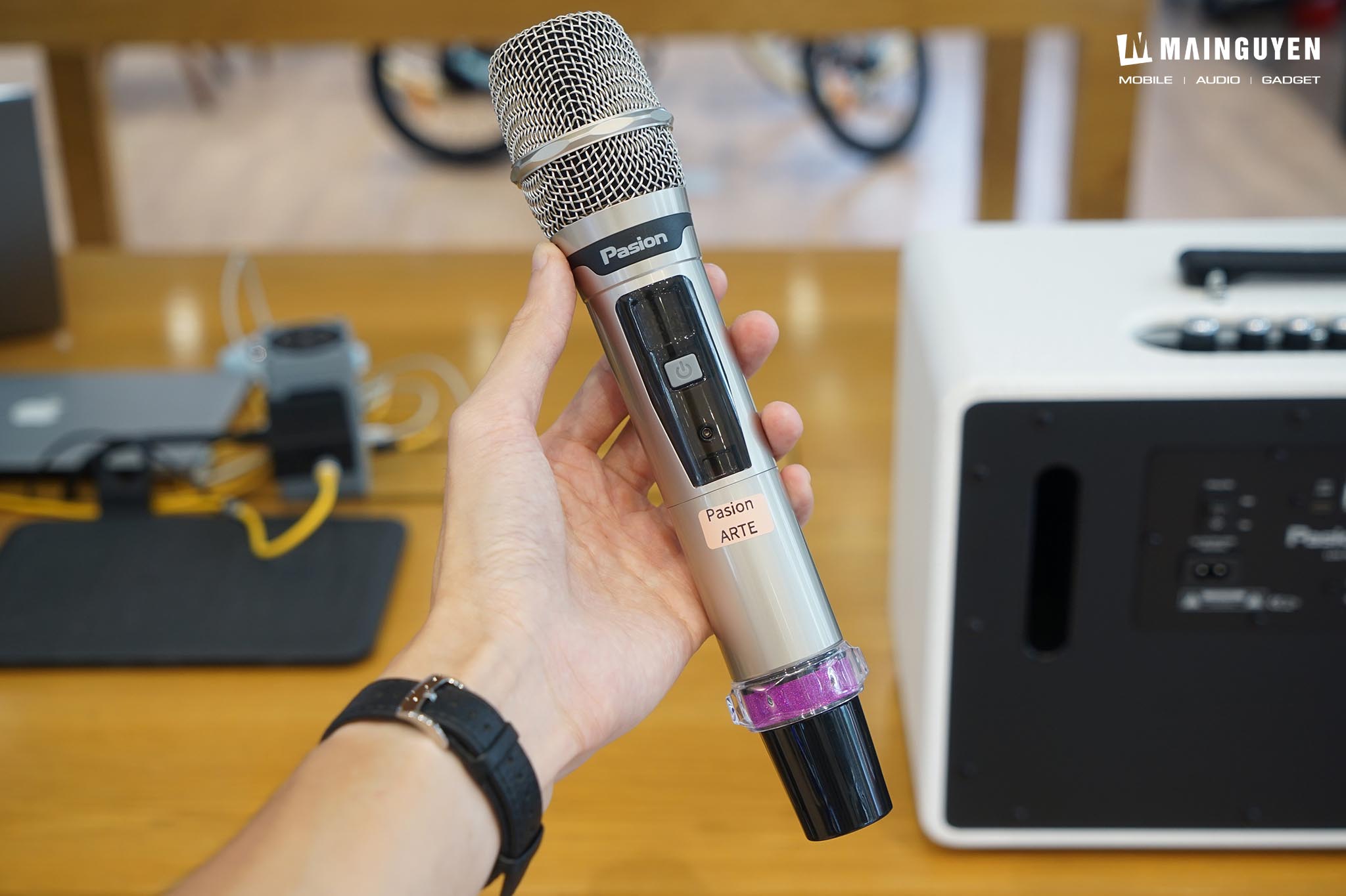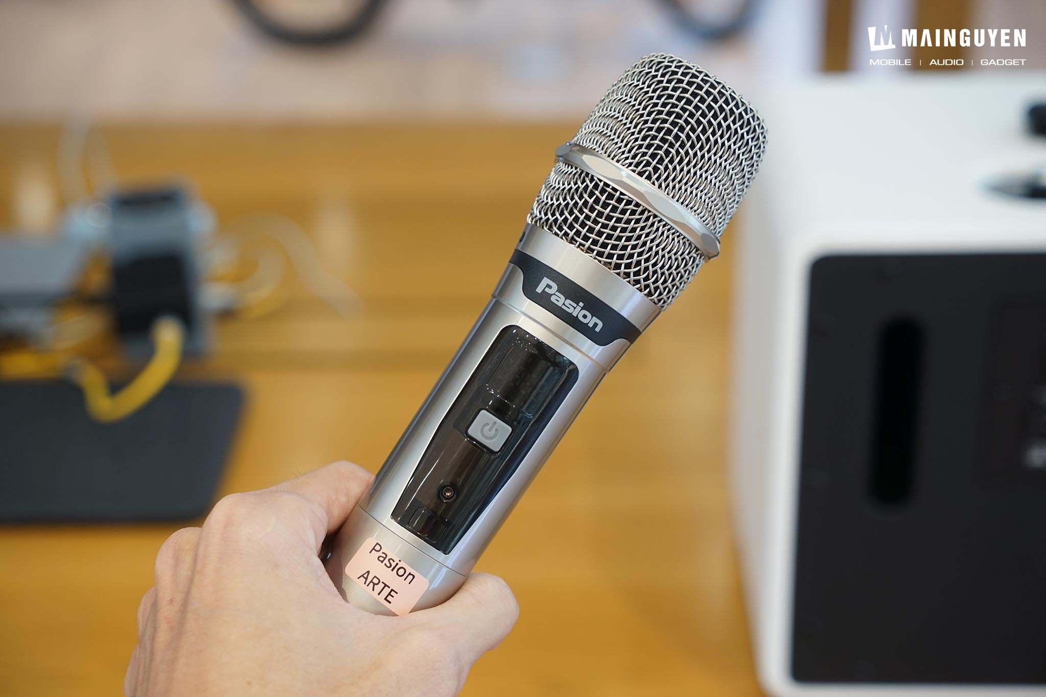 Bộ đôi micro không dây UHF đi kèm có độ nhạy cao, bắt âm tốt và đặc biệt là có khả năng "nâng đỡ" giọng hát, giúp giọng ca trở nên dày dặn và khỏe khoắn hơn. Tính năng Feedback Eliminate (Chống Hú) cũng hoạt động hiệu quả, giảm thiểu tiếng hú rít khó chịu khi hát trong không gian hẹp. Được trang bị bên trong khối pin sạc Lithium-iron dung lượng 6.000mAh (12.8V=6Ah, 76.8Wh) cho mức công suất tối đa 225W, kết hợp chức năng Speaker Pairing (SP) kết nối không dây 2 loa PASION Arte với nhau, loa karaoke di động PASION Arte sẽ mang đến trải nghiệm karaoke trọn vẹn trong mọi bữa tiệc trong nhà lẫn ngoài trời. Tổng kết nhanh, PASION Arte không phải là chiếc loa giá rẻ, nhưng nó mang lại giá trị xứng đáng cho phân khúc cao cấp với thiết kế độc đáo, trải nghiệm karaoke và nghe nhạc hay. Nó là lựa chọn hoàn hảo cho người dùng tìm kiếm sự kết hợp giữa nghệ thuật, công nghệ và khả năng giải trí mạnh mẽ.