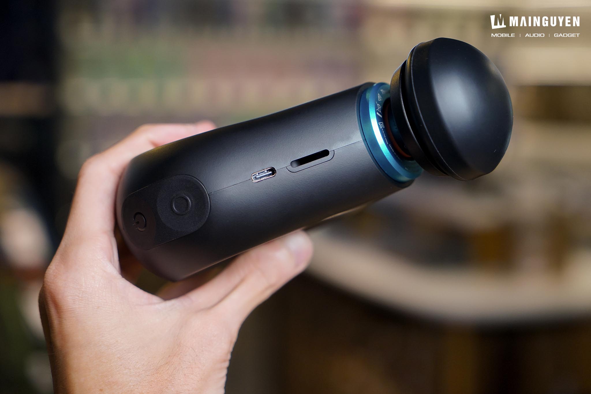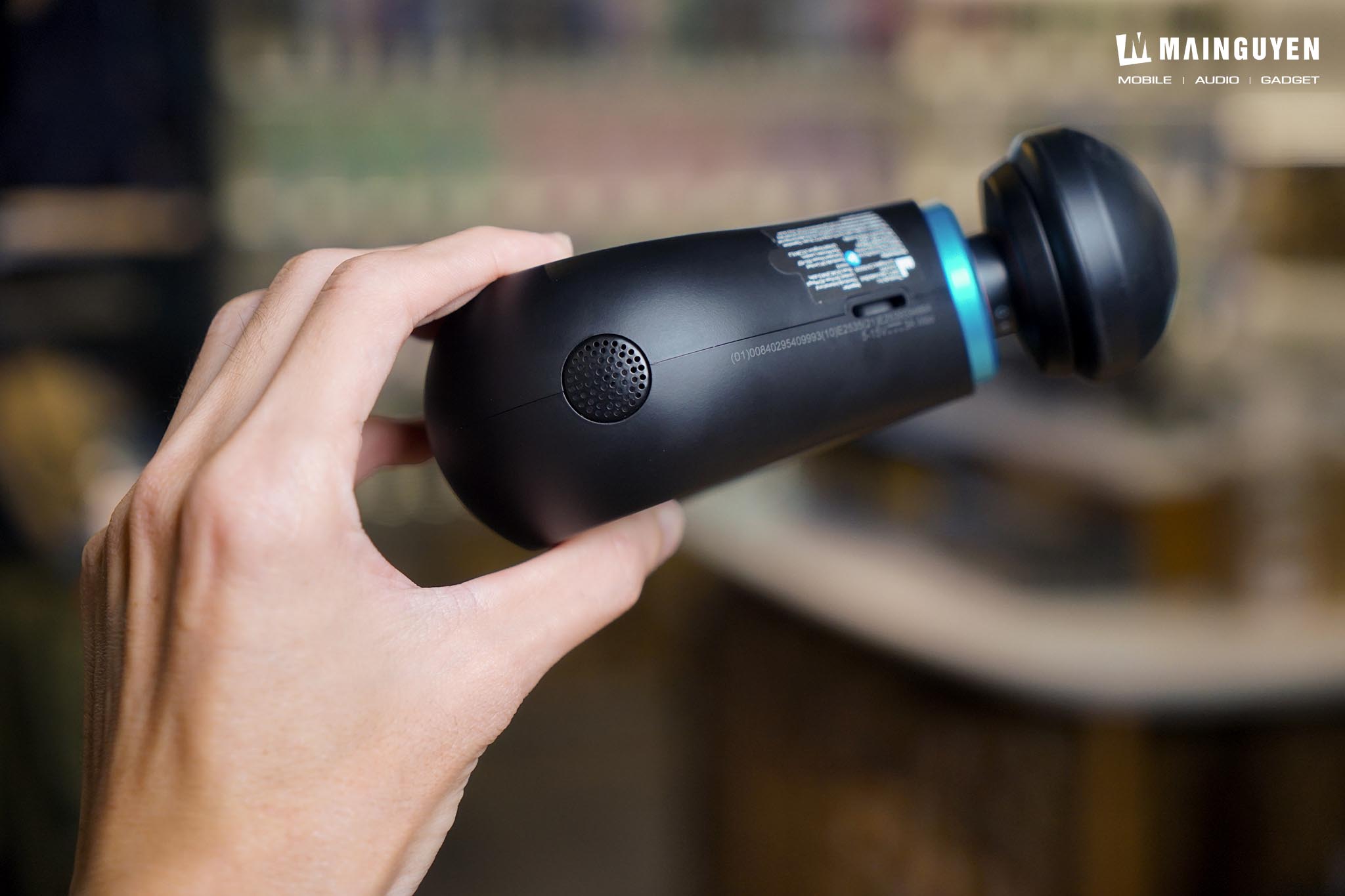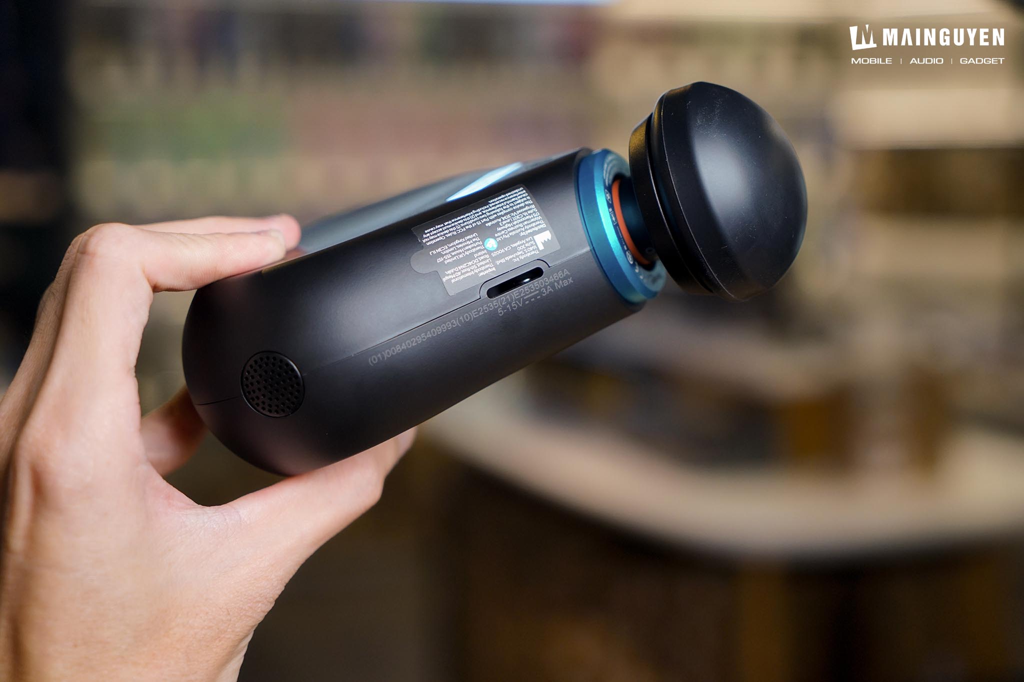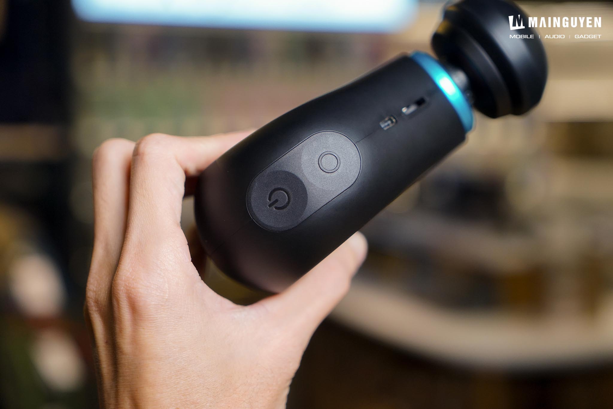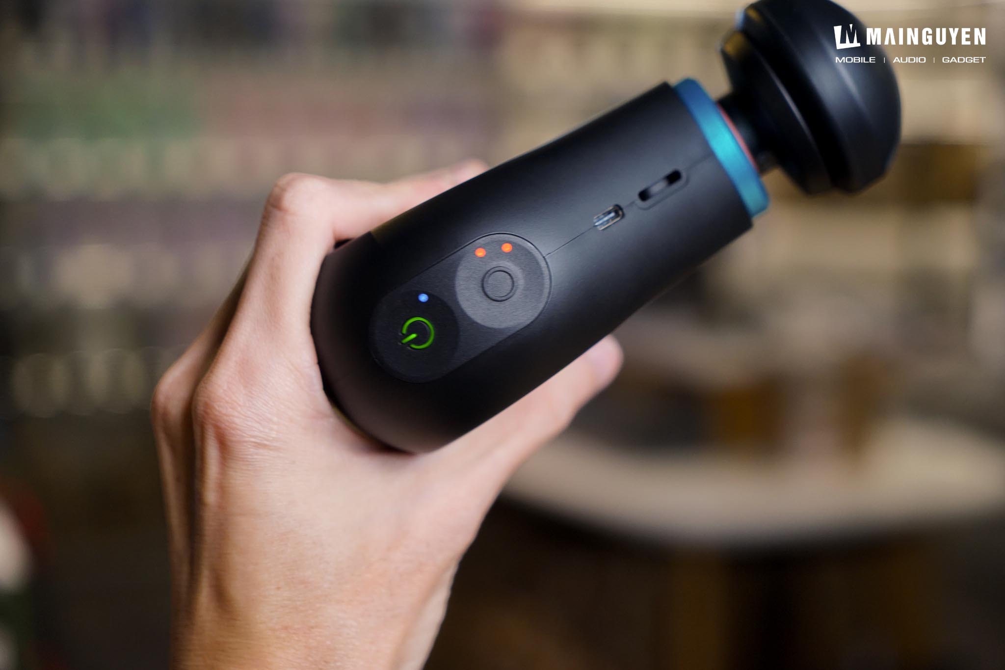 Hai cạnh bên vẫn là nơi bố trí khe tản nhiệt và cổng sạc USB-C. Điểm mới tiếp theo là có thêm nút bấm mềm để bật/tắt và chuyển qua lại 3 cấp độ nhiệt, đặt cạnh nút bật/tắt nguồn kiêm chuyển qua lại 3 cấp độ, tương tự như trên mẫu Theragun Prime Plus. Việc nhận biết bật/tắt nguồn, dung lượng pin còn lại cũng như 3 cấp độ mát xa và cấp độ nhiệt sẽ thông qua các đèn LED rất trực quan, riêng nút nguồn sẽ có đèn nền bên dưới.