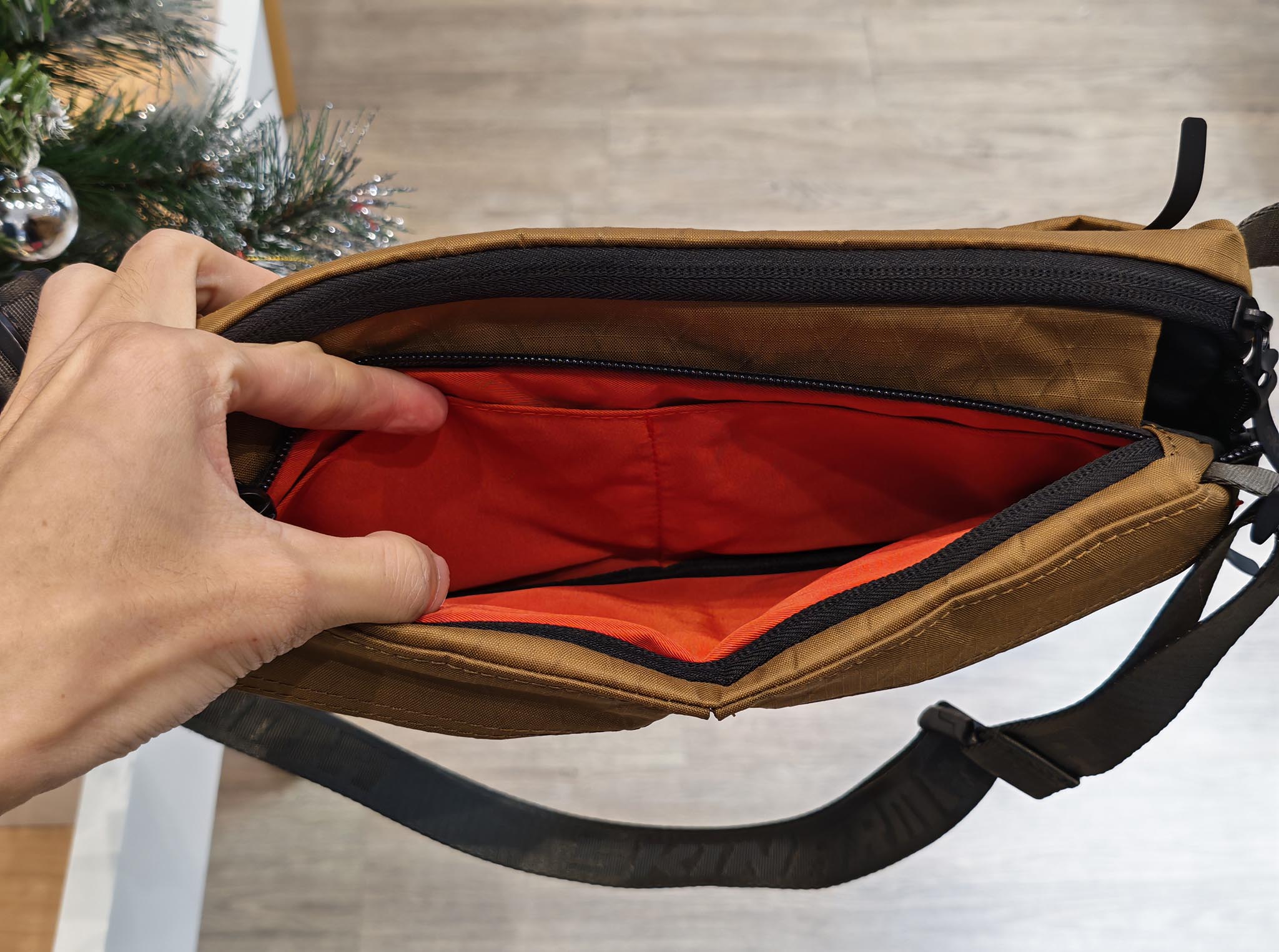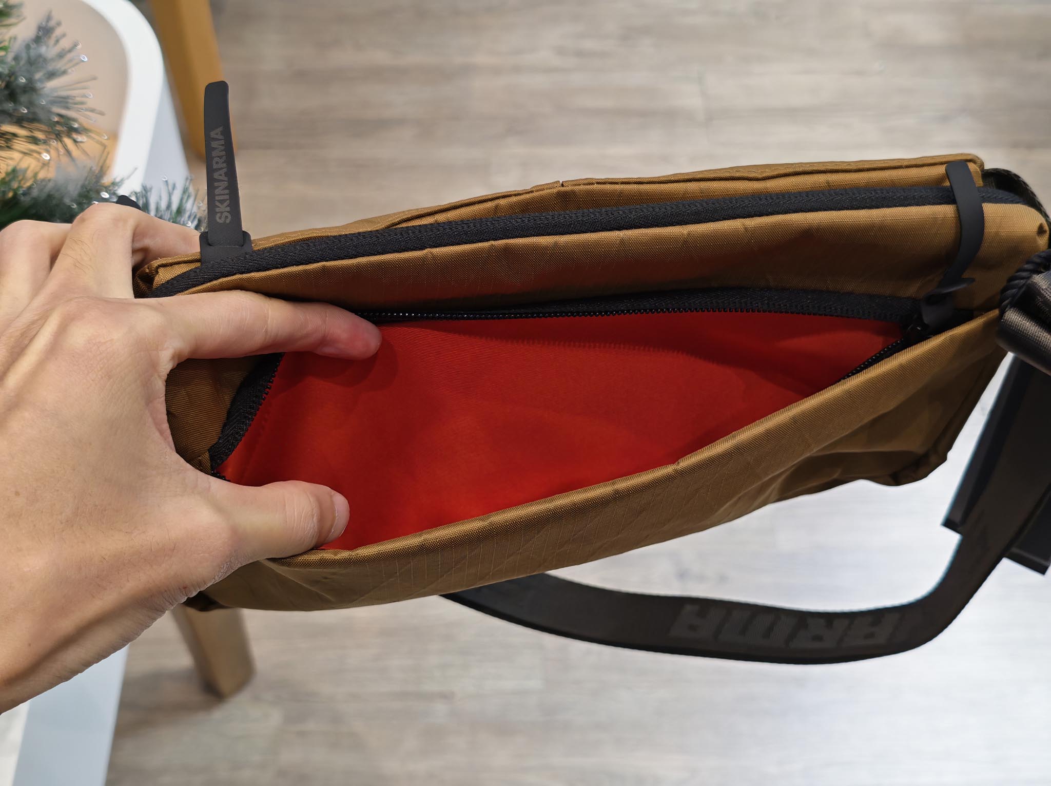 Cuối cùng là hai ngăn chính, mỗi ngăn lại có thêm hai túi nhỏ bên trong (tổng cộng 4 ngăn nhỏ), giúp người dùng dễ dàng phân loại và giữ cho đồ vật không bị lẫn lộn. Vải lót bên trong sử dụng tông màu đỏ để bạn dễ tìm đồ hơn trong điều kiện thiếu sáng. Chưa hết, túi đeo chéo Skinarma JAGER còn có thiết kế đặc biệt đó là ngăn trung tâm có thể mở rộng, để chứa vừa một chai nước hoặc cây dù nhỏ, những vật dụng cồng kềnh mà túi đeo chéo thông thường không thể mang được. Khóa kéo mở rộng ngăn được đặt ở bên hông, cho phép bạn thao tác mà không cần mở toàn bộ ngăn chính. Đây là một chi tiết thiết kế cực kỳ thông minh và tiện lợi cho người di chuyển liên tục.