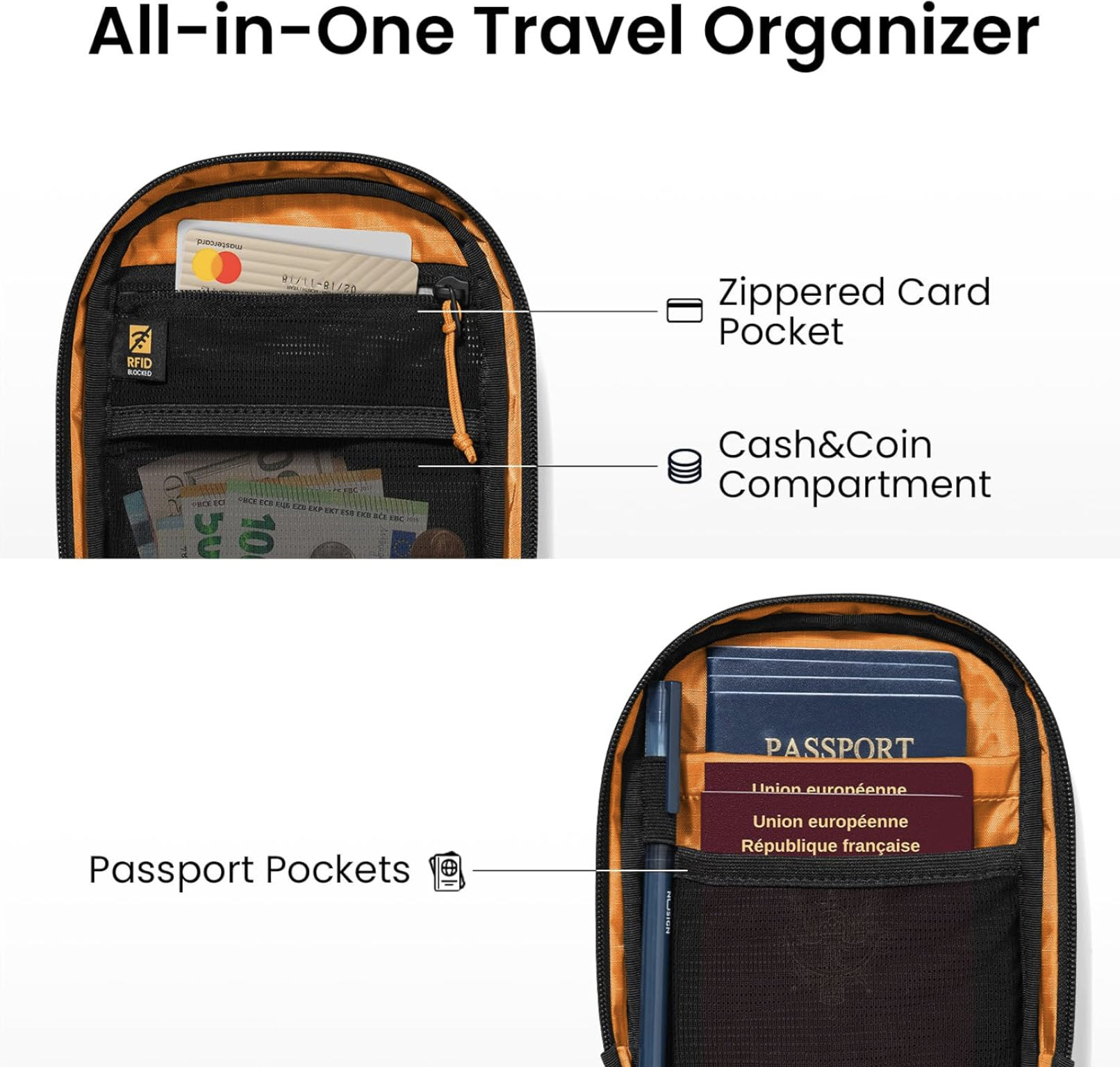 Bên trong ngăn chính còn có các ngăn nhỏ khác để bạn sắp xếp hộ chiếu, thẻ, tiền xu và bút. Điều này giúp mọi thứ luôn ngăn nắp, dễ tìm kiếm và không bị lộn xộn. Ngăn trượt bên ngoài: Túi có một ngăn trượt nhỏ ở phía sau, rất tiện lợi để cất vé máy bay, thẻ lên máy bay hoặc các loại thẻ cần lấy ra nhanh chóng.