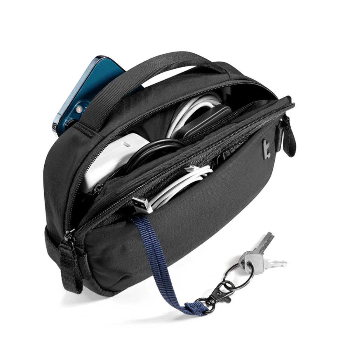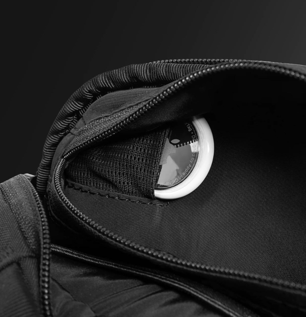 Đối với ngăn chính có nhiều không gian hơn để sử dụng, bên trong được phân bổ khá nhiều ngăn nhỏ khác nhau để bạn sắp xếp các phụ kiện sao cho phù hợp. Ngoài ra, hãng còn thiết kế thêm một ngăn ẩn để đựng AirTag hoặc thiết bị theo dõi, ngăn ẩn được làm bằng lưới và được giấu phía sau khóa kéo.